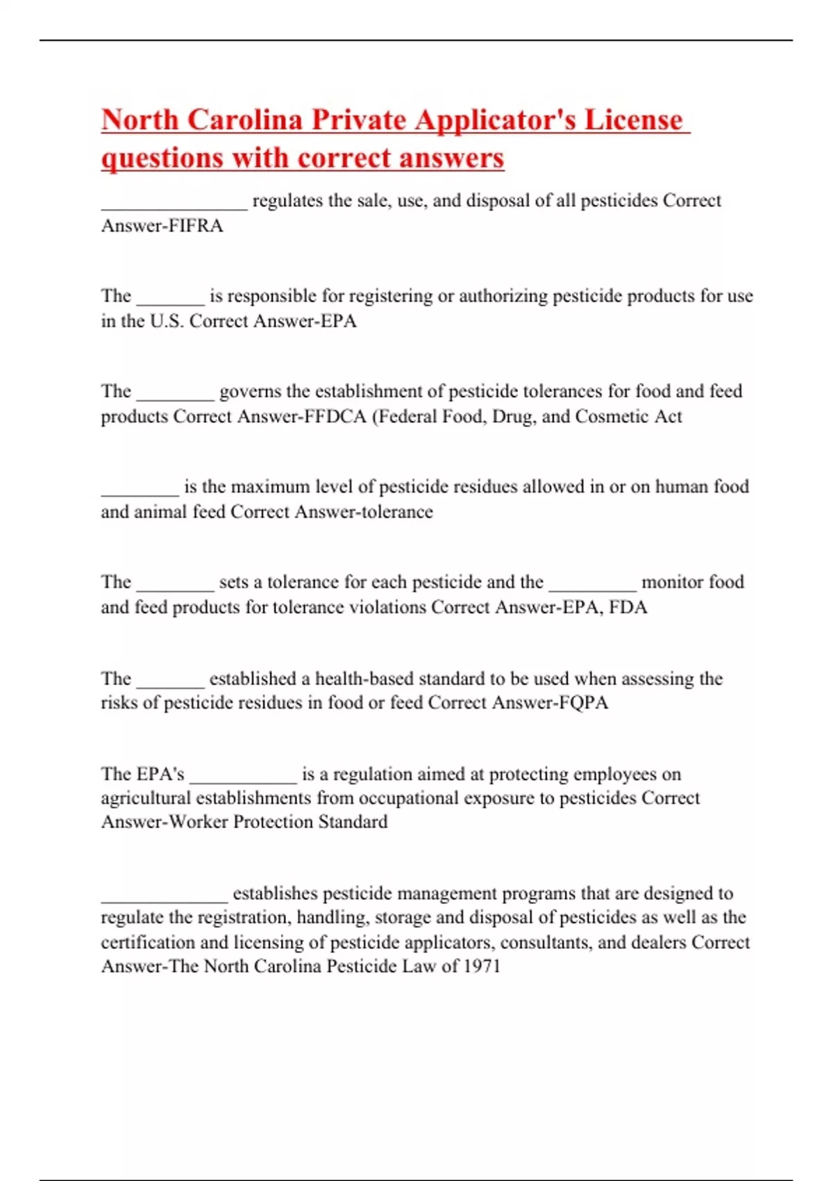 Answer-FIFRA The _______ is responsible for registering or authorizing pesticide products for use in the U.S. Correct Answer-EPA The ________ governs the establishment of pesticide tolerances for food and feed products Correct Answer-FFDCA (Federal Food, Drug, and Cosmetic Act ________ is the maximum level of pesticide residues allowed in or on human food and animal feed Correct Answer-tolerance The ________ sets a tolerance for each pesticide and the _________ monitor food and feed products for tolerance violations Correct Answer-EPA, FDA The _______ established a health-based standard to be used when assessing the risks of pesticide residues in food or feed Correct Answer-FQPA The EPA's ___________ is a regulation aimed at protecting employees on agricultural establishments from occupational exposure to pesticides Correct Answer-Worker Protection Standard _____________ establishes pesticide management programs that are designed to regulate the registration, handling, storage and disposal of pesticides as well as the certification and licensing of pesticide applicators, consultants, and dealers Correct Answer-The North Carolina Pesticide Law of 1971