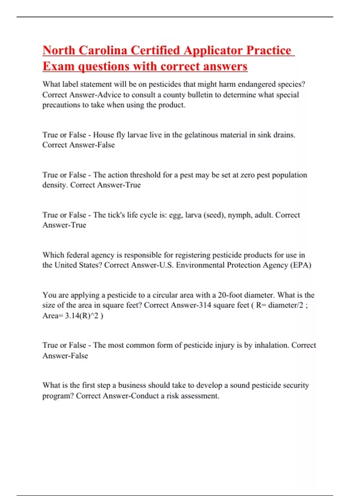 What label statement will be on pesticides that might harm endangered species? Correct Answer-Advice to consult a county bulletin to determine what special precautions to take when using the product. True or False - House fly larvae live in the gelatinous material in sink drains. Correct Answer-False True or False - The action threshold for a pest may be set at zero pest population density. Correct Answer-True True or False - The tick's life cycle is: egg, larva (seed), nymph, adult. Correct Answer-True Which federal agency is responsible for registering pesticide products for use in the United States? Correct Answer-U.S. Environmental Protection Agency (EPA) You are applying a pesticide to a circular area with a 20-foot diameter. What is the size of the area in square feet? Correct Answer-314 square feet ( R= diameter/2 ; Area= 3.14(R)^2 ) True or False - The most common form of pesticide injury is by inhalation. Correct Answer-False What is the first step a business should take to develop a sound pesticide security program? Correct Answer-Conduct a risk assessment.