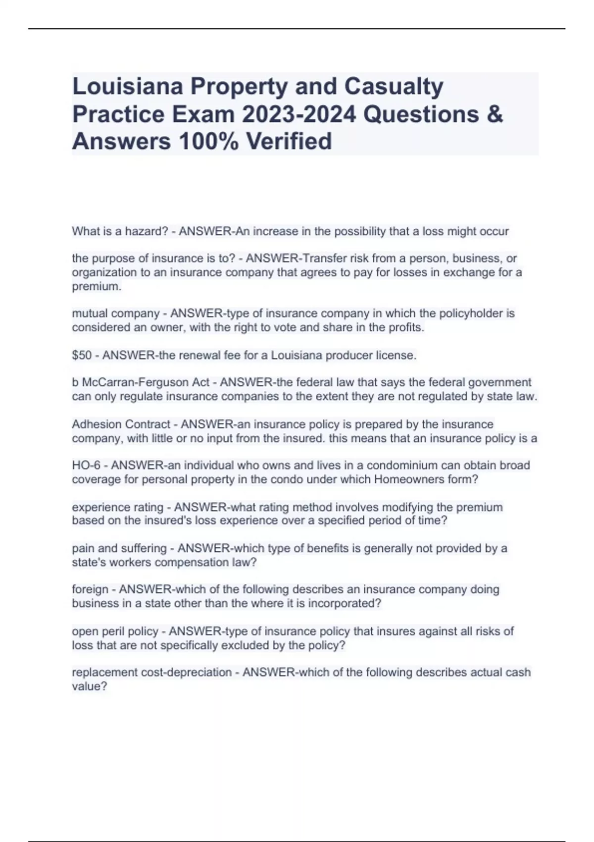 What is a hazard? - ANSWER-An increase in the possibility that a loss might occur the purpose of insurance is to? - ANSWER-Transfer risk from a person, business, or organization to an insurance company that agrees to pay for losses in exchange for a premium. mutual company - ANSWER-type of insurance company in which the policyholder is considered an owner, with the right to vote and share in the profits. $50 - ANSWER-the renewal fee for a Louisiana producer license. b McCarran-Ferguson Act - ANSWER-the federal law that says the federal government can only regulate insurance companies to the extent they are not regulated by state law. Adhesion Contract - ANSWER-an insurance policy is prepared by the insurance company, with little or no input from the insured. this means that an insurance policy is a HO-6 - ANSWER-an individual who owns and lives in a condominium can obtain broad coverage for personal property in the condo under which Homeowners form? experience rating - ANSWER-what rating method involves modifying the premium based on the insured's loss experience over a specified period of time? pain and suffering - ANSWER-which type of benefits is generally not provided by a state's workers compensation law? foreign - ANSWER-which of the following describes an insurance company doing business in a state other than the where it is incorporated?