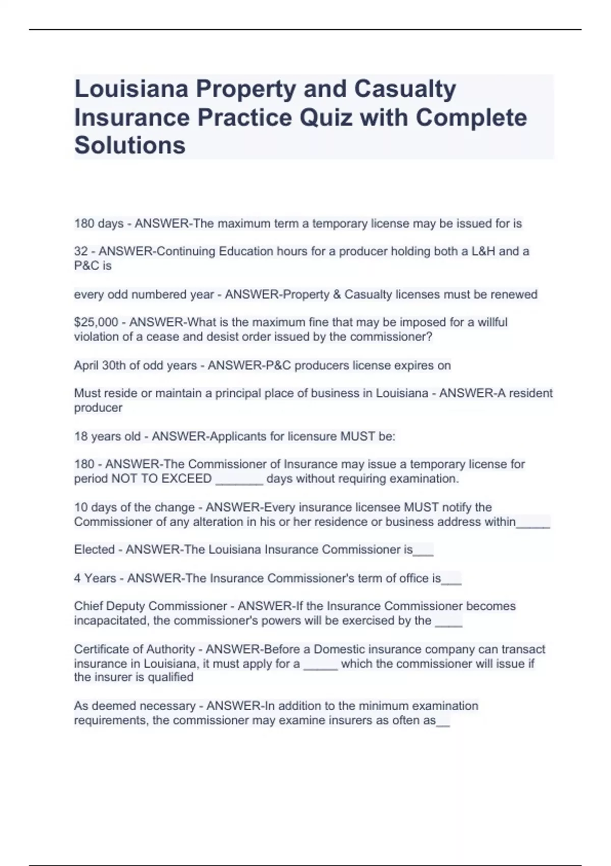 180 days - ANSWER-The maximum term a temporary license may be issued for is 32 - ANSWER-Continuing Education hours for a producer holding both a L&H and a P&C is every odd numbered year - ANSWER-Property & Casualty licenses must be renewed $25,000 - ANSWER-What is the maximum fine that may be imposed for a willful violation of a cease and desist order issued by the commissioner? April 30th of odd years - ANSWER-P&C producers license expires on Must reside or maintain a principal place of business in Louisiana - ANSWER-A resident producer 18 years old - ANSWER-Applicants for licensure MUST be: 180 - ANSWER-The Commissioner of Insurance may issue a temporary license for period NOT TO EXCEED _______ days without requiring examination. 10 days of the change - ANSWER-Every insurance licensee MUST notify the Commissioner of any alteration in his or her residence or business address within_____ Elected - ANSWER-The Louisiana Insurance Commissioner is___ 4 Years - ANSWER-The Insurance Commissioner's term of office is___ Chief Deputy Commissioner - ANSWER-If the Insurance Commissioner becomes incapacitated, the commissioner's powers will be exercised by the ____ Certificate of Authority - ANSWER-Before a Domestic insurance company can transact insurance in Louisiana, it must apply for a _____ which the commissioner will issue if the insurer is qualified As deemed necessary - ANSWER-In addition to the minimum examination requirements, the commissioner may examine insurers as often as__