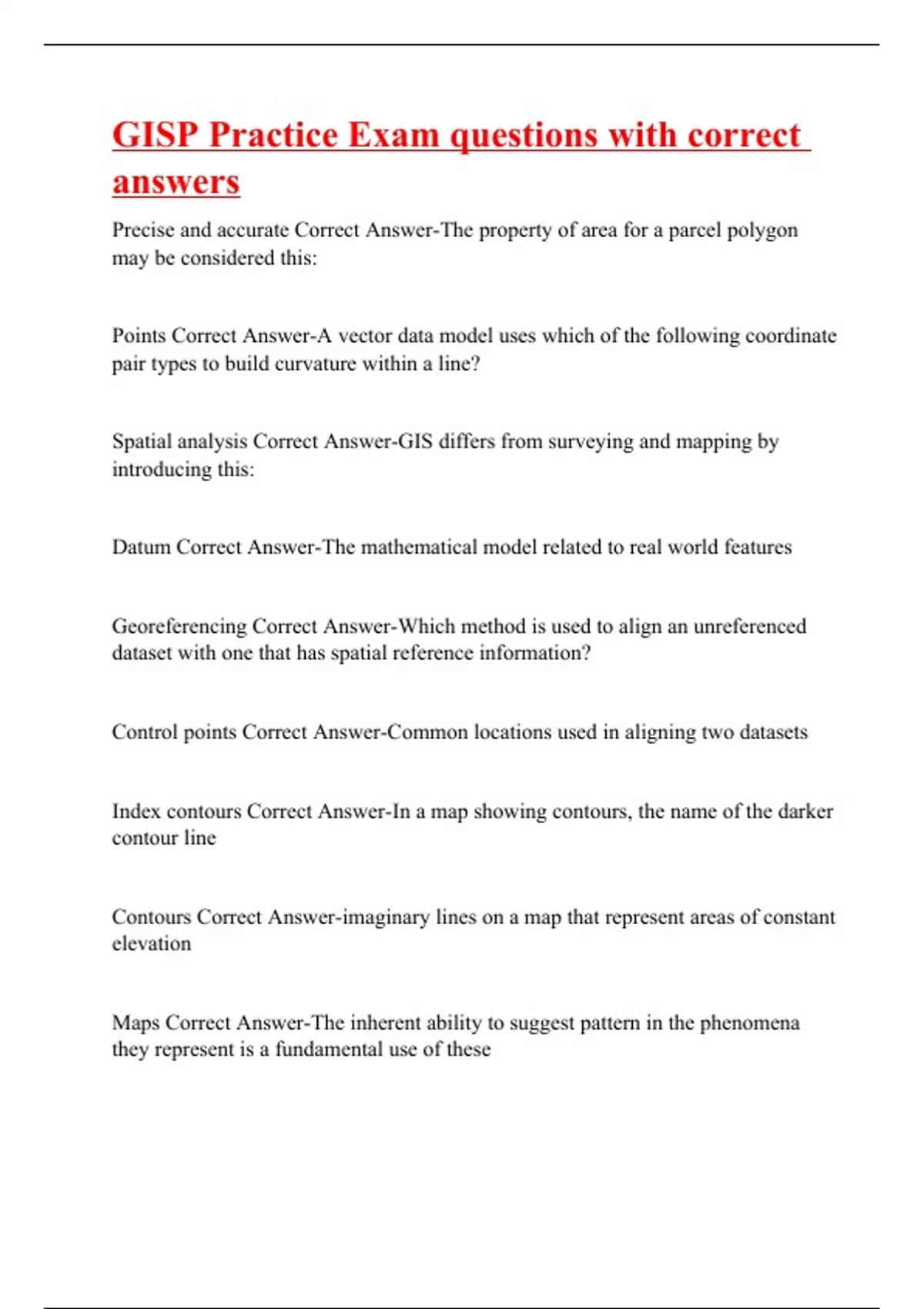Precise and accurate Correct Answer-The property of area for a parcel polygon may be considered this: Points Correct Answer-A vector data model uses which of the following coordinate pair types to build curvature within a line? Spatial analysis Correct Answer-GIS differs from surveying and mapping by introducing this: Datum Correct Answer-The mathematical model related to real world features Georeferencing Correct Answer-Which method is used to align an unreferenced dataset with one that has spatial reference information? Control points Correct Answer-Common locations used in aligning two datasets Index contours Correct Answer-In a map showing contours, the name of the darker contour line Contours Correct Answer-imaginary lines on a map that represent areas of constant elevation Maps Correct Answer-The inherent ability to suggest pattern in the phenomena they represent is a fundamental use of these