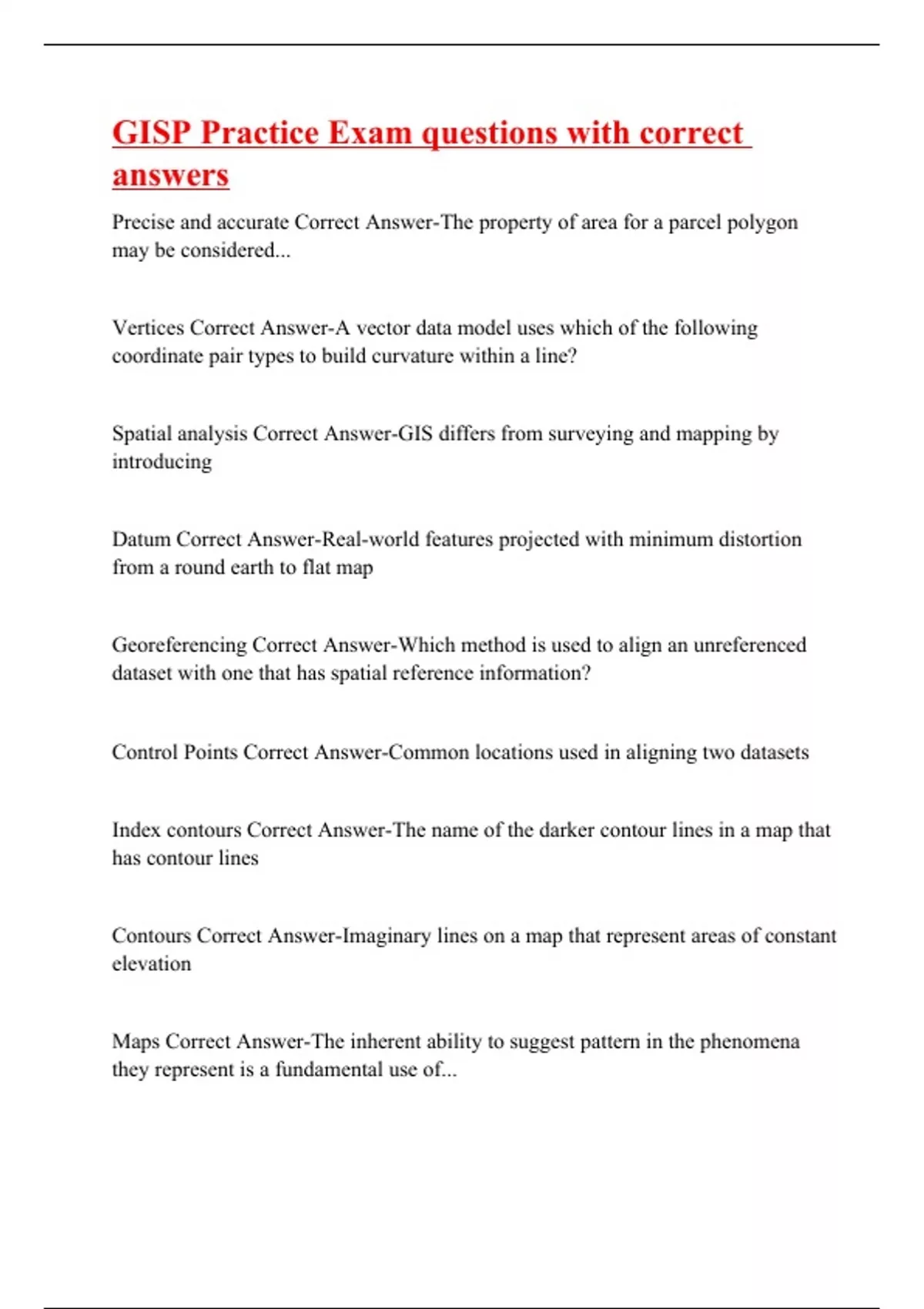 Precise and accurate Correct Answer-The property of area for a parcel polygon may be considered... Vertices Correct Answer-A vector data model uses which of the following coordinate pair types to build curvature within a line? Spatial analysis Correct Answer-GIS differs from surveying and mapping by introducing Datum Correct Answer-Real-world features projected with minimum distortion from a round earth to flat map Georeferencing Correct Answer-Which method is used to align an unreferenced dataset with one that has spatial reference information? Control Points Correct Answer-Common locations used in aligning two datasets Index contours Correct Answer-The name of the darker contour lines in a map that has contour lines Contours Correct Answer-Imaginary lines on a map that represent areas of constant elevation Maps Correct Answer-The inherent ability to suggest pattern in the phenomena they represent is a fundamental use of...