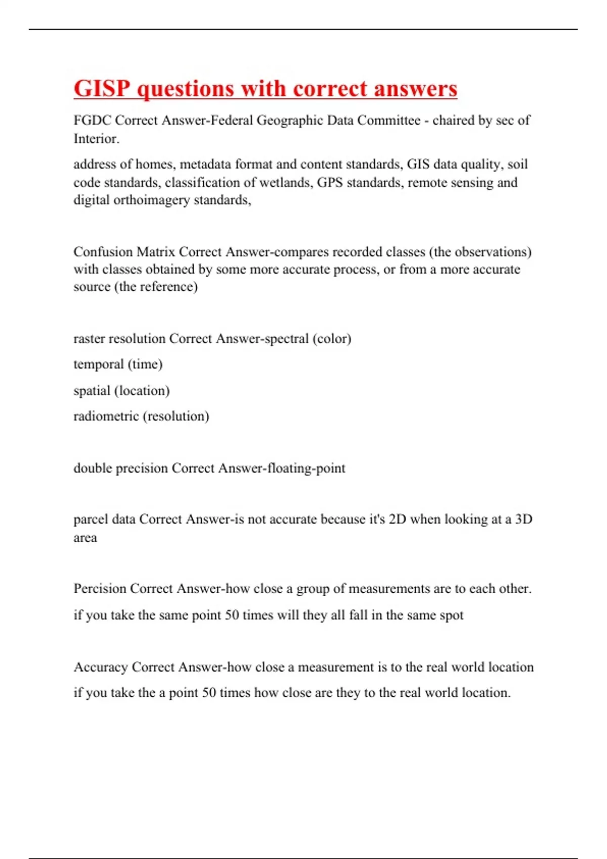 FGDC Correct Answer-Federal Geographic Data Committee - chaired by sec of Interior. address of homes, metadata format and content standards, GIS data quality, soil code standards, classification of wetlands, GPS standards, remote sensing and digital orthoimagery standards, Confusion Matrix Correct Answer-compares recorded classes (the observations) with classes obtained by some more accurate process, or from a more accurate source (the reference) raster resolution Correct Answer-spectral (color) temporal (time) spatial (location) radiometric (resolution) double precision Correct Answer-floating-point parcel data Correct Answer-is not accurate because it's 2D when looking at a 3D area Percision Correct Answer-how close a group of measurements are to each other. if you take the same point 50 times will they all fall in the same spot Accuracy Correct Answer-how close a measurement is to the real world location if you take the a point 50 times how close are they to the real world location.