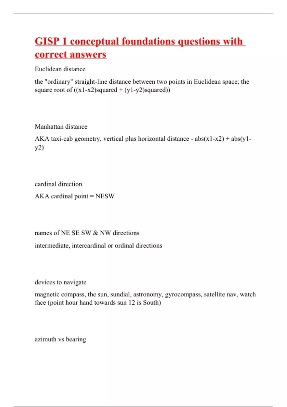 Euclidean distance the "ordinary" straight-line distance between two points in Euclidean space; the square root of ((x1-x2)squared + (y1-y2)squared)) Manhattan distance AKA taxi-cab geometry, vertical plus horizontal distance - abs(x1-x2) + abs(y1-y2) cardinal direction AKA cardinal point = NESW names of NE SE SW & NW directions intermediate, intercardinal or ordinal directions devices to navigate magnetic compass, the sun, sundial, astronomy, gyrocompass, satellite nav, watch face (point hour hand towards sun 12 is South) azimuth vs bearing azimuth uses 360°, bearing uses 90° + u