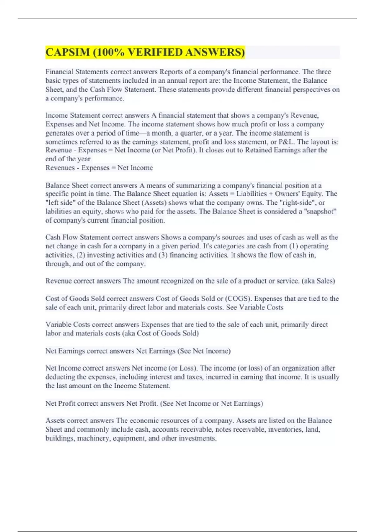 Financial Statements correct answers Reports of a company's financial performance. The three basic types of statements included in an annual report are: the Income Statement, the Balance Sheet, and the Cash Flow Statement. These statements provide different financial perspectives on a company's performance. Income Statement correct answers A financial statement that shows a company's Revenue, Expenses and Net Income. The income statement shows how much profit or loss a company generates over a period of time—a month, a quarter, or a year. The income statement is sometimes referred to as the earnings statement, profit and loss statement, or P&L. The layout is: Revenue - Expenses = Net Income (or Net Profit). It closes out to Retained Earnings after the end of the year. Revenues - Expenses = Net Income Balance Sheet correct answers A means of summarizing a company's financial position at a specific point in time. The Balance Sheet equation is: Assets = Liabilities + Owners' Equity. The "left side" of the Balance Sheet (Assets) shows what the company owns. The "right-side", or labilities an equity, shows who paid for the assets. The Balance Sheet is considered a "snapshot" of company's current financial position. Cash Flow Statement correct answers Shows a company's sources and uses of cash as well as the net change in cash for a company in a given period. It's categories are cash from (1) operating activities, (2) investing activities and (3) financing activities. It shows the flow of cash in, through, and out of the company. Revenue correct answers The amount recognized on the sale of a product or service. (aka Sales) Cost of Goods Sold correct answers Cost of Goods Sold or (COGS). Expenses that are tied to the sale of each unit, primarily direct labor and materials costs. See Variable Costs Variable Costs correct answers Expenses that are tied to the sale of each unit, primarily direct labor and materials costs (aka Cost of Goods Sold) Net Earnings correct answers Net Earnings (See Net Income) Net Income correct answers Net income (or Loss). The income (or loss) of an organization after deducting the expenses, including interest and taxes, incurred in earning that income. It is usually the last amount on the Income Statement. Net Profit correct answers Net Profit. (See Net Income or Net Earnings) Assets correct answers The economic resources of a company. Assets are listed on the Balance Sheet and commonly include cash, accounts receivable, notes receivable, inventories, land, buildings, machinery, equipment, and other investments.