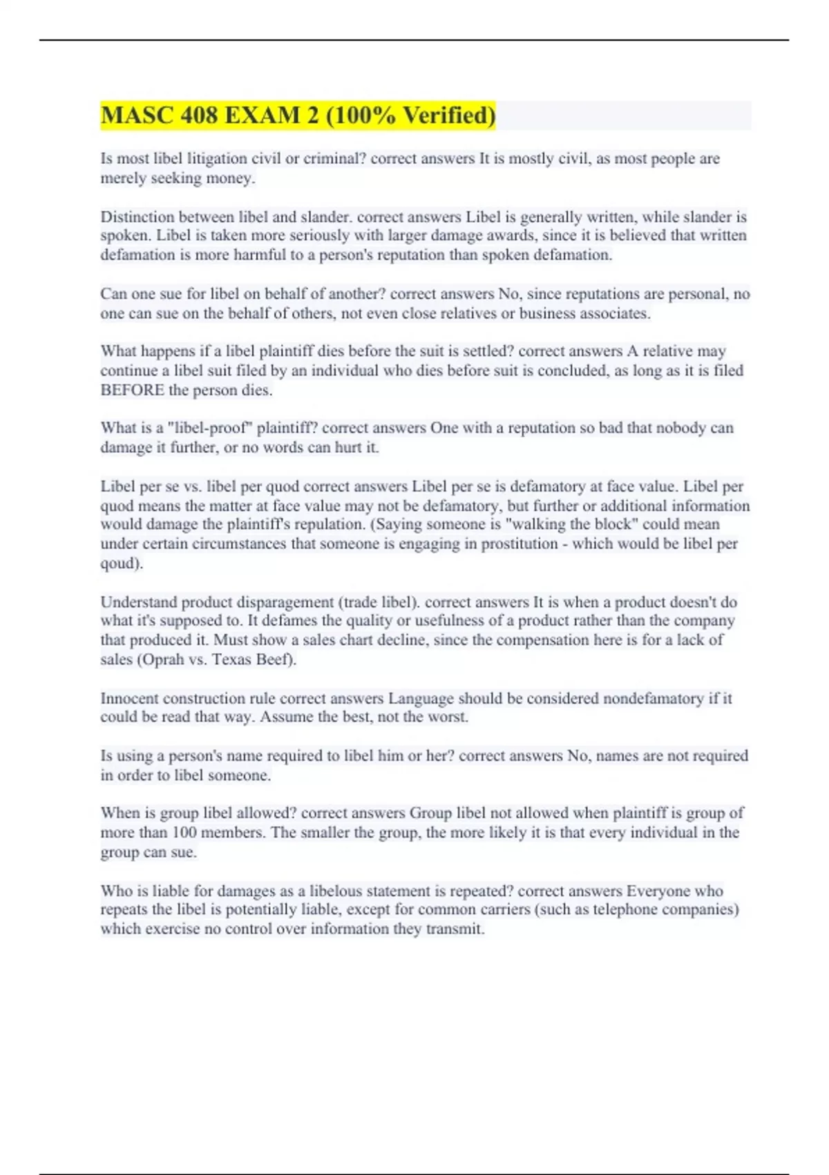 Is most libel litigation civil or criminal? correct answers It is mostly civil, as most people are merely seeking money. Distinction between libel and slander. correct answers Libel is generally written, while slander is spoken. Libel is taken more seriously with larger damage awards, since it is believed that written defamation is more harmful to a person's reputation than spoken defamation. Can one sue for libel on behalf of another? correct answers No, since reputations are personal, no one can sue on the behalf of others, not even close relatives or business associates. What happens if a libel plaintiff dies before the suit is settled? correct answers A relative may continue a libel suit filed by an individual who dies before suit is concluded, as long as it is filed BEFORE the person dies. What is a "libel-proof" plaintiff? correct answers One with a reputation so bad that nobody can damage it further, or no words can hurt it. Libel per se vs. libel per quod correct answers Libel per se is defamatory at face value. Libel per quod means the matter at face value may not be defamatory, but further or additional information would damage the plaintiff's repulation. (Saying someone is "walking the block" could mean under certain circumstances that someone is engaging in prostitution - which would be libel per qoud). Understand product disparagement (trade libel). correct answers It is when a product doesn't do what it's supposed to. It defames the quality or usefulness of a product rather than the company that produced it. Must show a sales chart decline, since the compensation here is for a lack of sales (Oprah vs. Texas Beef). Innocent construction rule correct answers Language should be considered nondefamatory if it could be read that way. Assume the best, not the worst. Is using a person's name required to libel him or her? correct answers No, names are not required in order to libel someone. When is group libel allowed? correct answers Group libel not allowed when plaintiff is group of more than 100 members. The smaller the group, the more likely it is that every individual in the group can sue. Who is liable for damages as a libelous statement is repeated? correct answers Everyone who repeats the libel is potentially liable, except for common carriers (such as telephone companies) which exercise no control over information they transmit.