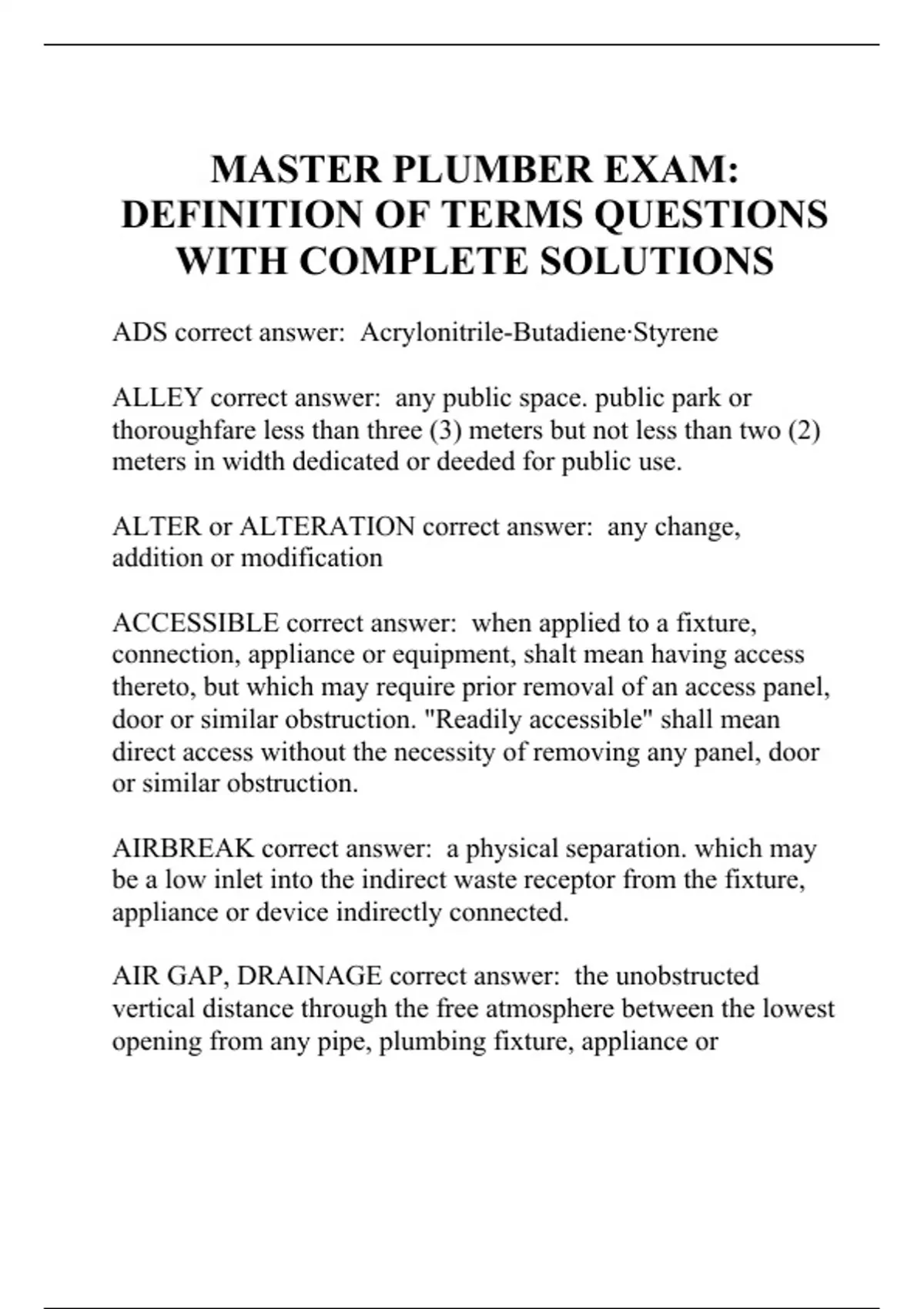 MASTER PLUMBER EXAM: DEFINITION OF TERMS QUESTIONS WITH COMPLETE SOLUTIONS