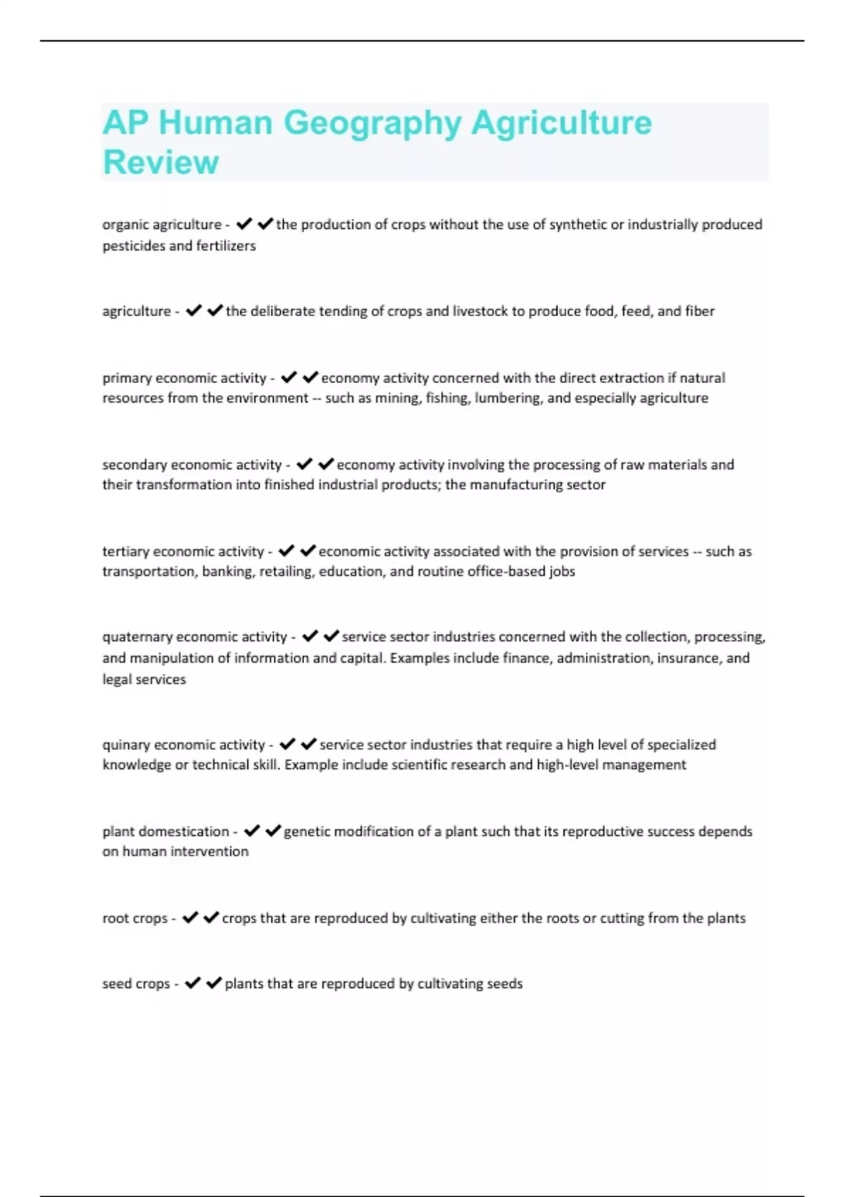 organic agriculture - the production of crops without the use of synthetic or industrially produced pesticides and fertilizers agriculture - the deliberate tending of crops and livestock to produce food, feed, and fiber primary economic activity - economy activity concerned with the direct extraction if natural resources from the environment -- such as mining, fishing, lumbering, and especially agriculture secondary economic activity - economy activity involving the processing of raw materials and their transformation into finished industrial products; the manufacturing sector tertiary economic activity - economic activity associated with the provision of services -- such as transportation, banking, retailing, education, and routine office-based jobs quaternary economic activity - service sector industries concerned with the collection, processing, and manipulation of information and capital. Examples include finance, administration, insurance, and legal services quinary economic activity - service sector industries that require a high level of specialized knowledge or technical skill. Example include scientific research and high-level management plant domestication - genetic modification of a plant such that its reproductive success depends on human intervention root crops - crops that are reproduced by cultivating either the roots or cutting from the plants seed crops - plants that are reproduced by cultivating seedsFirst Agriculture Revolution - Dating back to 8,000-14,000 years ago, this revolution achieved plant and animal domestication as well as from root crops to seed crops. It was also the shift from nomadic settlements to permanent settlements and from hunter gatherer societies to agricultural societies