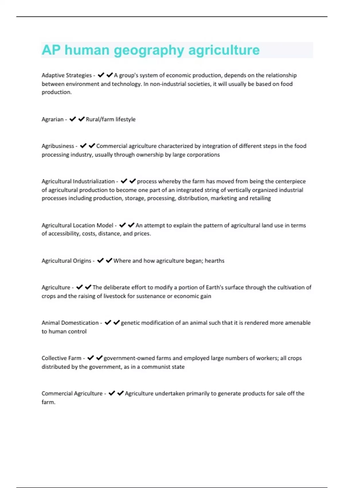 Adaptive Strategies - A group's system of economic production, depends on the relationship between environment and technology. In non-industrial societies, it will usually be based on food production. Agrarian - Rural/farm lifestyle Agribusiness - Commercial agriculture characterized by integration of different steps in the food processing industry, usually through ownership by large corporations Agricultural Industrialization - process whereby the farm has moved from being the centerpiece of agricultural production to become one part of an integrated string of vertically organized industrial processes including production, storage, processing, distribution, marketing and retailing Agricultural Location Model - An attempt to explain the pattern of agricultural land use in terms of accessibility, costs, distance, and prices. Agricultural Origins - Where and how agriculture began; hearths Agriculture - The deliberate effort to modify a portion of Earth's surface through the cultivation of crops and the raising of livestock for sustenance or economic gain Animal Domestication - genetic modification of an animal such that it is rendered more amenable to human control Collective Farm - government-owned farms and employed large numbers of workers; all crops distributed by the government, as in a communist state Commercial Agriculture - Agriculture undertaken primarily to generate products for sale off the farm.Intensive Commercial Agriculture - any kind of agriculture activity that involves effective and efficient use of labor on small plots of land to maximize crop yield