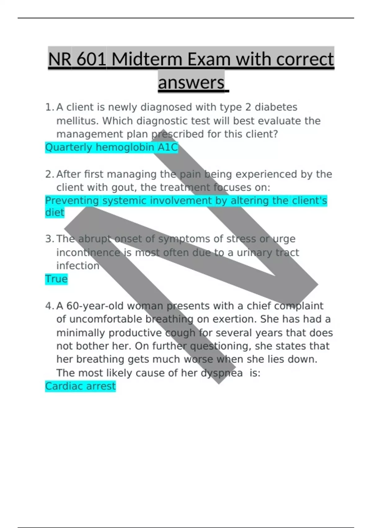 NR 601 Midterm Exam with correct answers 1. A client is newly diagnosed with type 2 diabetes mellitus. Which diagnostic test will best evaluate the management plan prescribed for this client? Quarterly hemoglobin A1C 2. After first managing the pain being experienced by the client with gout, the treatment focuses on: Preventing systemic involvement by altering the client's diet 3. The abrupt onset of symptoms of stress or urge incontinence is most often due to a urinary tract infection True 4. A 60-year-old woman presents with a chief complaint of uncomfortable breathing on exertion. She has had a minimally productive cough for several years that does not bother her. On further questioning, she states that her breathing gets much worse when she lies down. The most likely cause of her dyspnea is: Cardiac arrest