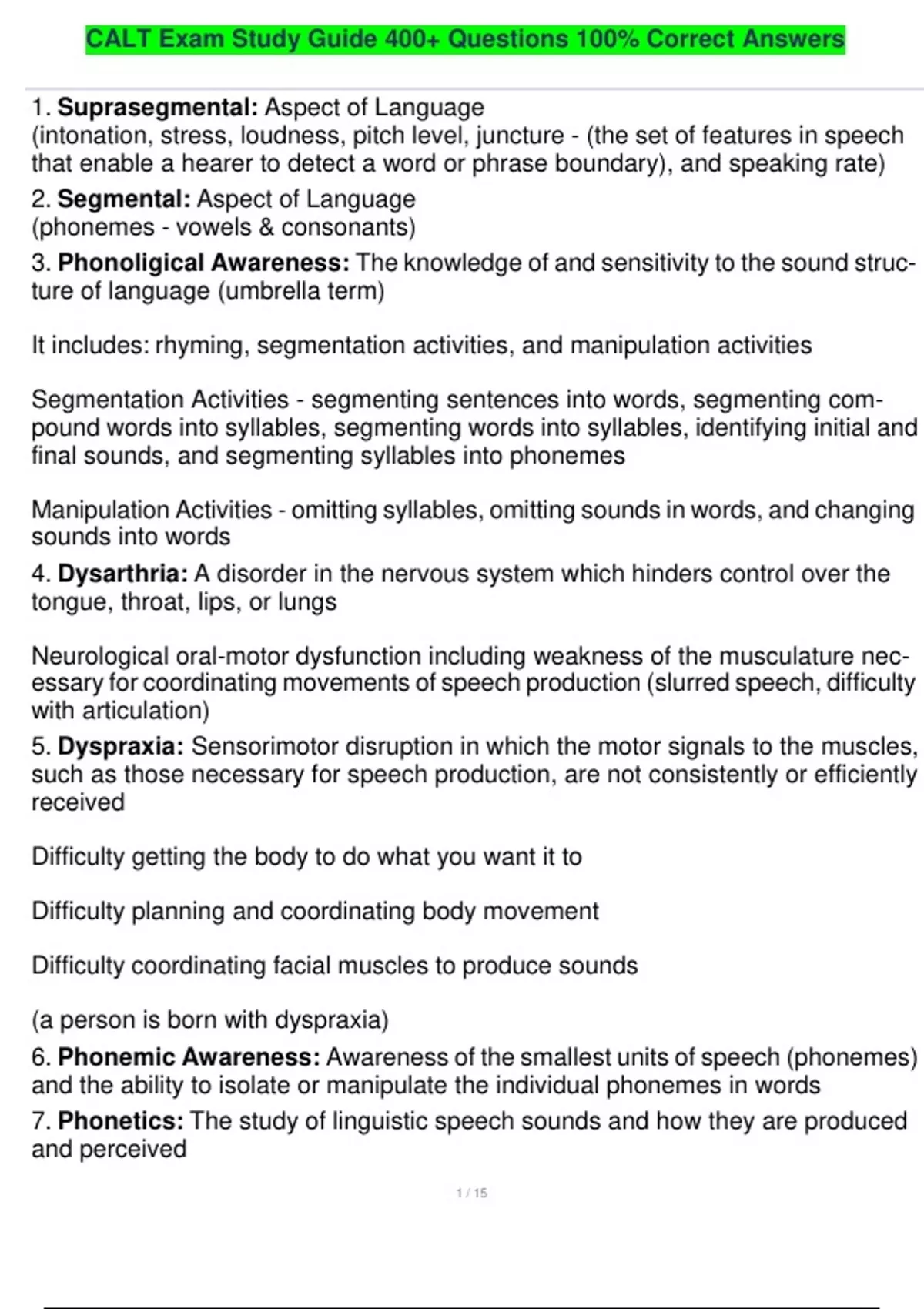 1. Suprasegmental: Aspect of Language (intonation, stress, loudness, pitch level, juncture - (the set of features in speech that enable a hearer to detect a word or phrase boundary), and speaking rate) 2. Segmental: Aspect of Language (phonemes - vowels & consonants) 3. Phonoligical Awareness: The knowledge of and sensitivity to the sound structure of language (umbrella term) It includes: rhyming, segmentation activities, and manipulation activities Segmentation Activities - segmenting sentences into words, segmenting compound words into syllables, segmenting words into syllables, identifying initial and final sounds, and segmenting syllables into phonemes Manipulation Activities - omitting syllables, omitting sounds in words, and changing sounds into words