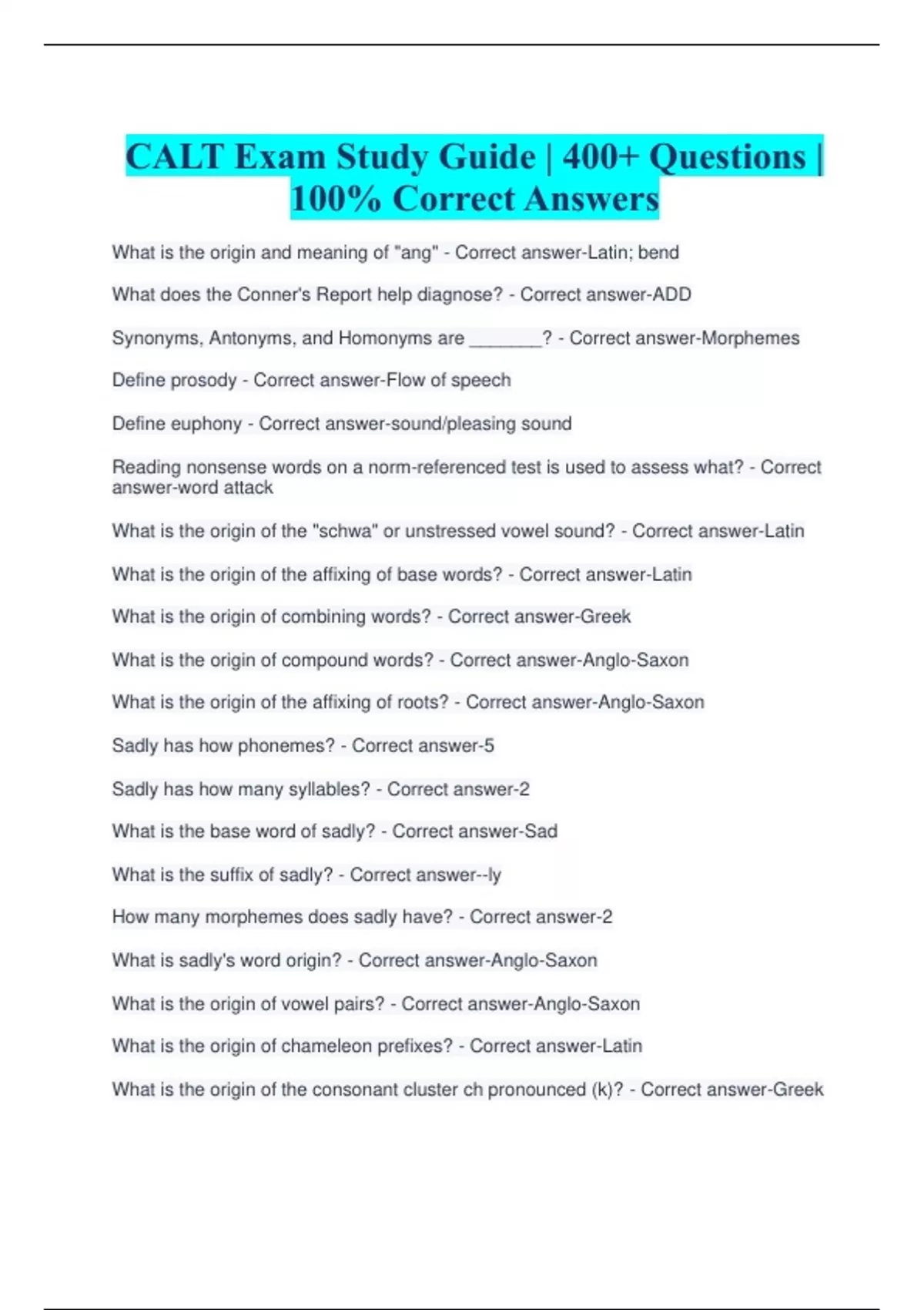 What is the origin and meaning of "ang" - Correct answer-Latin; bend What does the Conner's Report help diagnose? - Correct answer-ADD Synonyms, Antonyms, and Homonyms are _______? - Correct answer-Morphemes Define prosody - Correct answer-Flow of speech Define euphony - Correct answer-sound/pleasing sound Reading nonsense words on a norm-referenced test is used to assess what? - Correct answer-word attack What is the origin of the "schwa" or unstressed vowel sound? - Correct answer-Latin What is the origin of the affixing of base words? - Correct answer-Latin What is the origin of combining words? - Correct answer-Greek What is the origin of compound words? - Correct answer-Anglo-Saxon