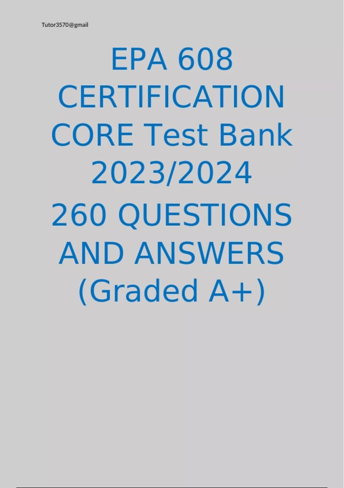 EPA 608 CERTIFICATION CORE Test Bank 2023/2024 260 QUESTIONS AND ANSWERS (Graded A+)