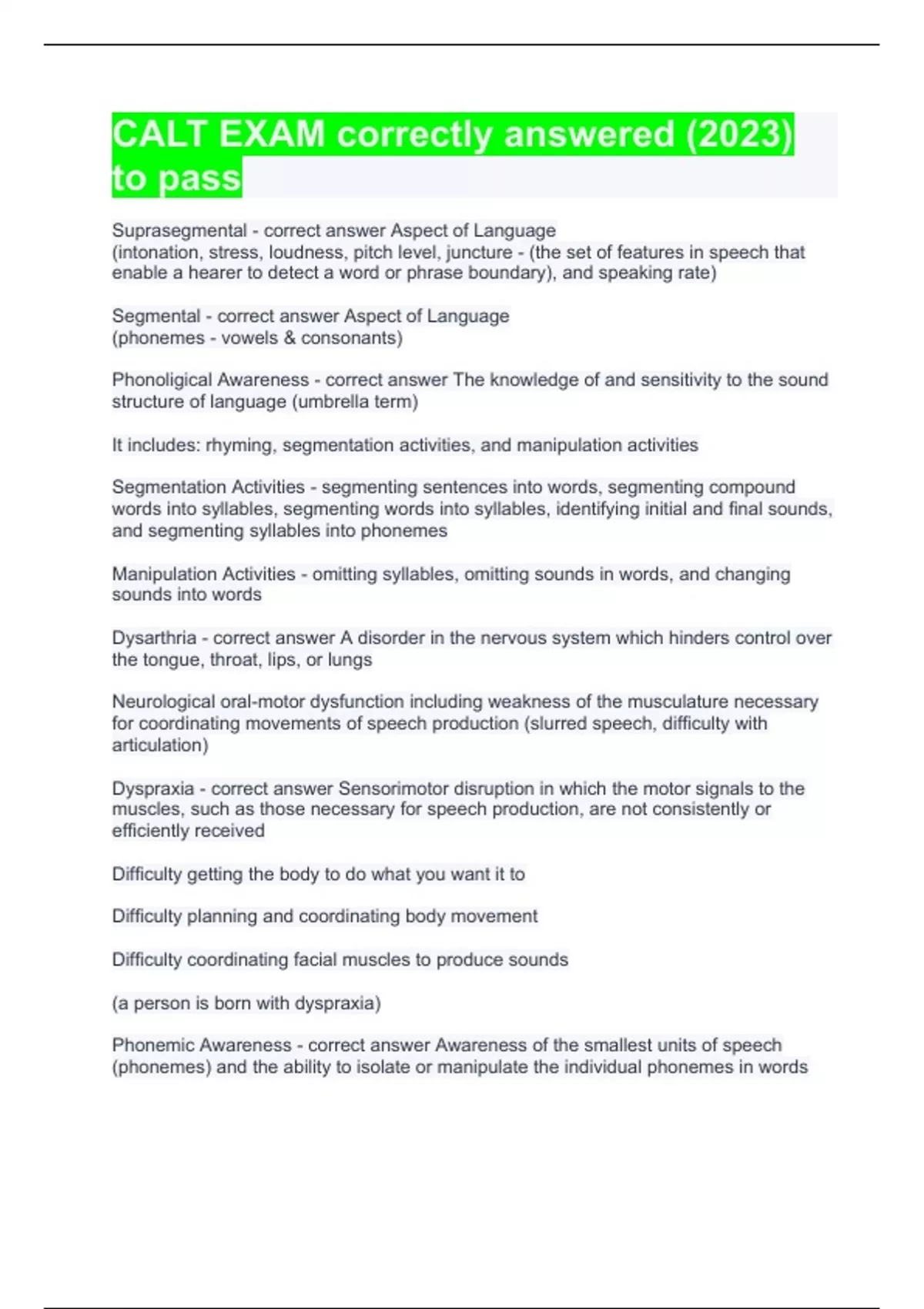 Suprasegmental - correct answer Aspect of Language (intonation, stress, loudness, pitch level, juncture - (the set of features in speech that enable a hearer to detect a word or phrase boundary), and speaking rate) Segmental - correct answer Aspect of Language (phonemes - vowels & consonants) Phonoligical Awareness - correct answer The knowledge of and sensitivity to the sound structure of language (umbrella term) It includes: rhyming, segmentation activities, and manipulation activities Segmentation Activities - segmenting sentences into words, segmenting compound words into syllables, segmenting words into syllables, identifying initial and final sounds, and segmenting syllables into phonemes Manipulation Activities - omitting syllables, omitting sounds in words, and changing sounds into words