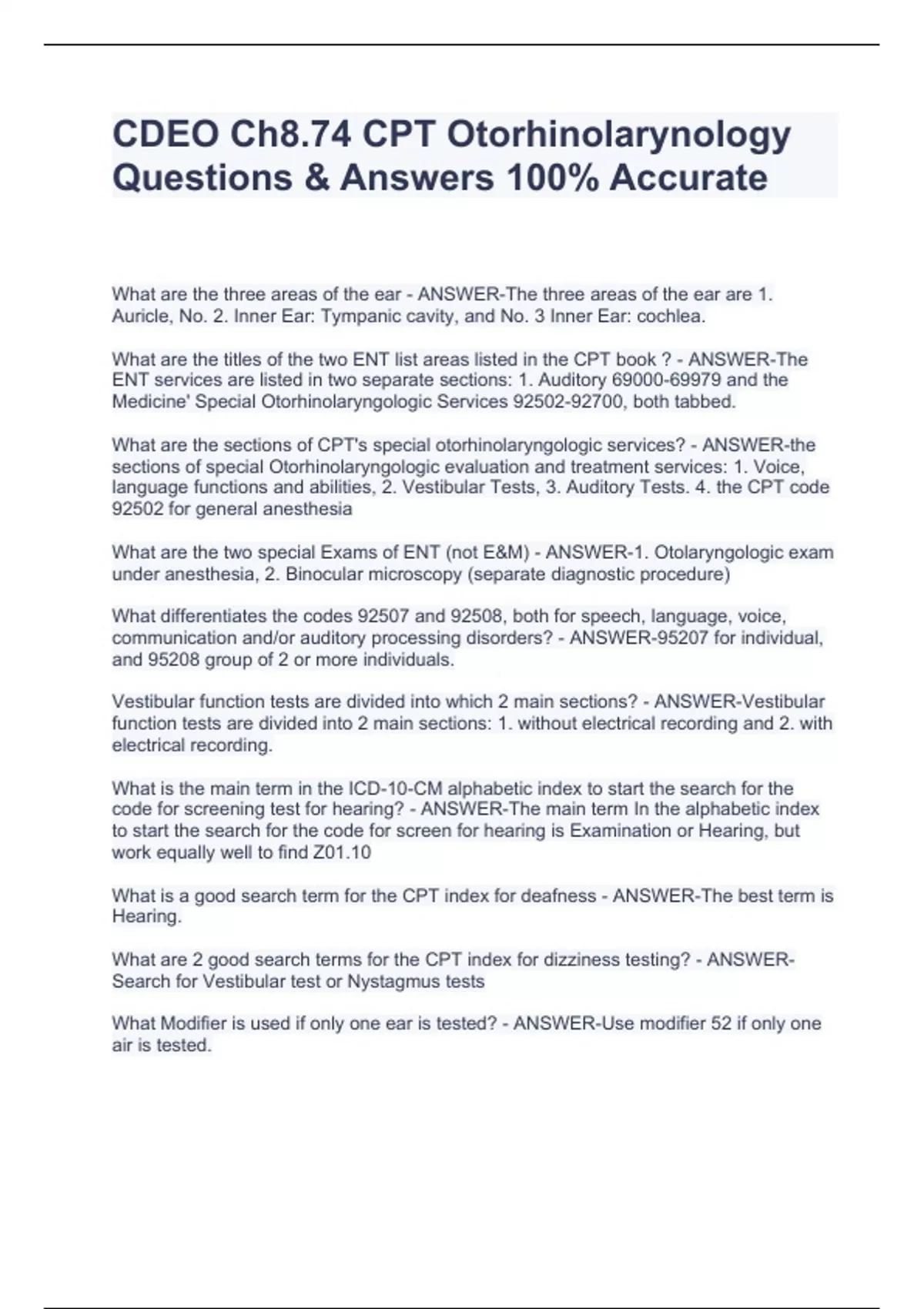 CDEO Ch8.74 CPT Otorhinolarynology Questions & Answers 100% Accurate