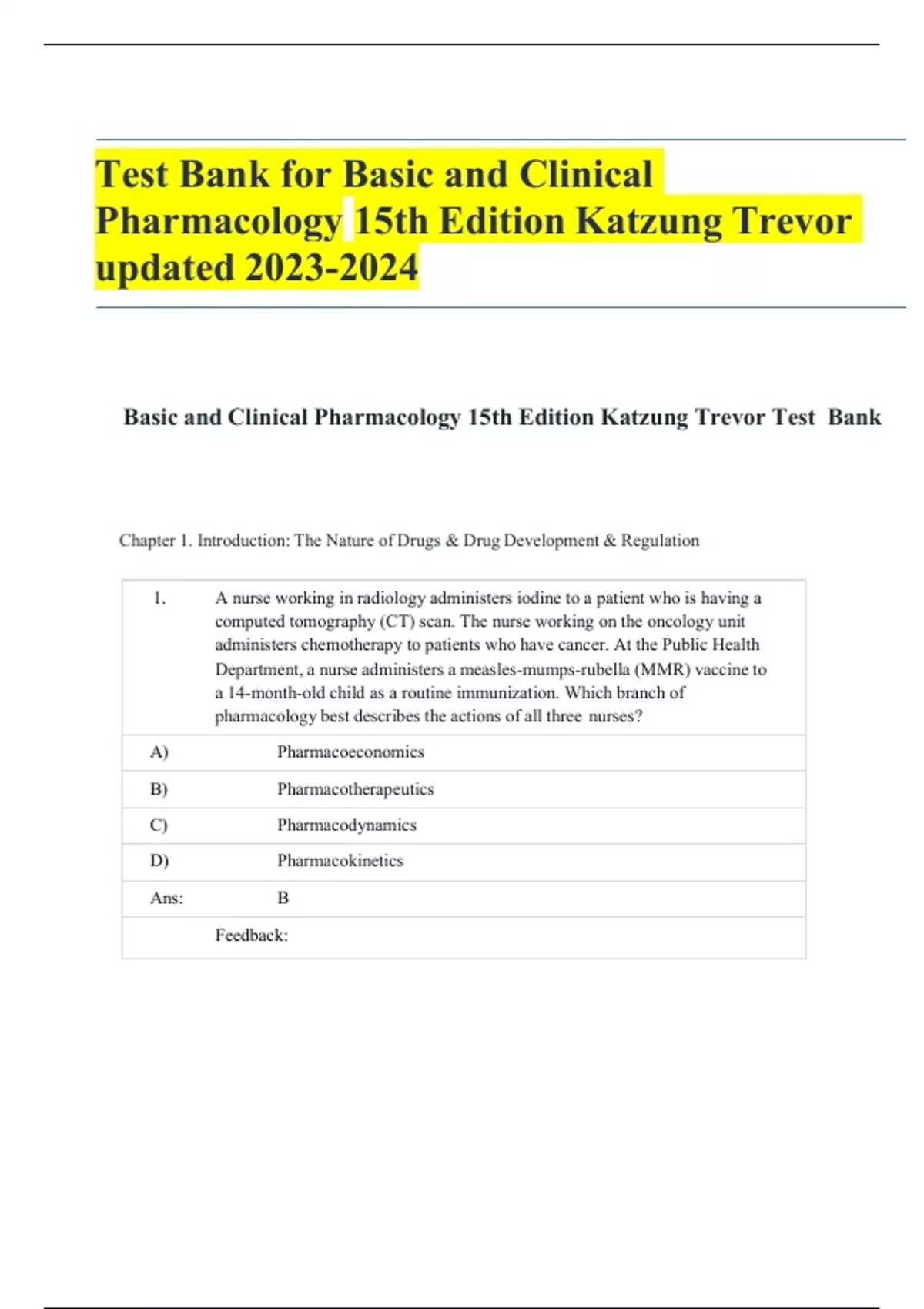 Test Bank for Basic and Clinical Pharmacology 15th Edition Katzung Trevor updated Basic and Clinical Pharmacology 15th Edition Katzung Trevor Test Bank Chapter 1. Introduction: The Nature of Drugs & Drug Development & Regulation 1. A nurse working in radiology administers iodine to a patient who is having a computed tomography (CT) scan. The nurse working on the oncology unit administers chemotherapy to patients who have cancer. At the Public Health Department, a nurse administers a measles-mumps-rubella (MMR) vaccine to a 14-month-old child as a routine immunization. Which branch of pharmacology best describes the actions of all three nurses? A) Pharmacoeconomics B) Pharmacotherapeutics C) Pharmacodynamics D) Pharmacokinetics Ans: B Feedback: Pharmacology is the study of the biologic effects of chemicals. Nurses are involved with clinical pharmacology or pharmacotherapeutics, which is a branch of pharmacology that deals with the uses of drugs to treat, prevent, and diagnose disease. The radiology nurse is administering a drug to help diagnose a disease. The oncology nurse is administering a drug to help treat a disease. Pharmacoeconomics includes any costs involved in drug therapy. Pharmacodynamics involves how a drug affects the body and pharmacokinetics is how the body acts on the body. 2. When involved in phase III drug evaluation studies, what responsibilities would the nurse have? A) Working with animals who are given experimental drugs B) Choosing appropriate patients to be involved in the drug study C) Monitoring and observing patients closely for adverse effects D) Conducting research to determine effectiveness of the drug Ans: C Feedback: Phase III studies involve use of a drug in a vast clinical population in which patients are asked to record any symptoms they experience while taking the drugs. Nurses may be responsible for helping collect and analyze the information to be shared with the Food and Drug Administration (FDA) but would not conduct research independently because nurses do not prescribe medications. Use of animals in drug testing is done in the preclinical trials. Select patients who are involved in phase II studies to participate in studies where the participants have the disease the drug is intended to treat. These patients are monitored closely for drug action and adverse effects. Phase I studies involve healthy human volunteers who are usually paid for their participation. Nurses may observe for adverse effects and toxicity. 3. A physician has ordered intramuscular (IM) injections of morphine, a narcotic, every 4 hours as needed for pain in a motor vehicle accident victim. The nurse is aware this drug has a high abuse potential. Under what category would morphine be classified? A) Schedule I B) Schedule II C) Schedule III D) Schedule IV Ans: B Feedback: Narcotics with a high abuse potential are classified as Schedule II drugs because of severe dependence liability. Schedule I drugs have high abuse potential and no accepted medical use. Schedule III drugs have a lesser abuse potential than II and an accepted medical use. Schedule IV drugs have low abuse potential and limited dependence liability.