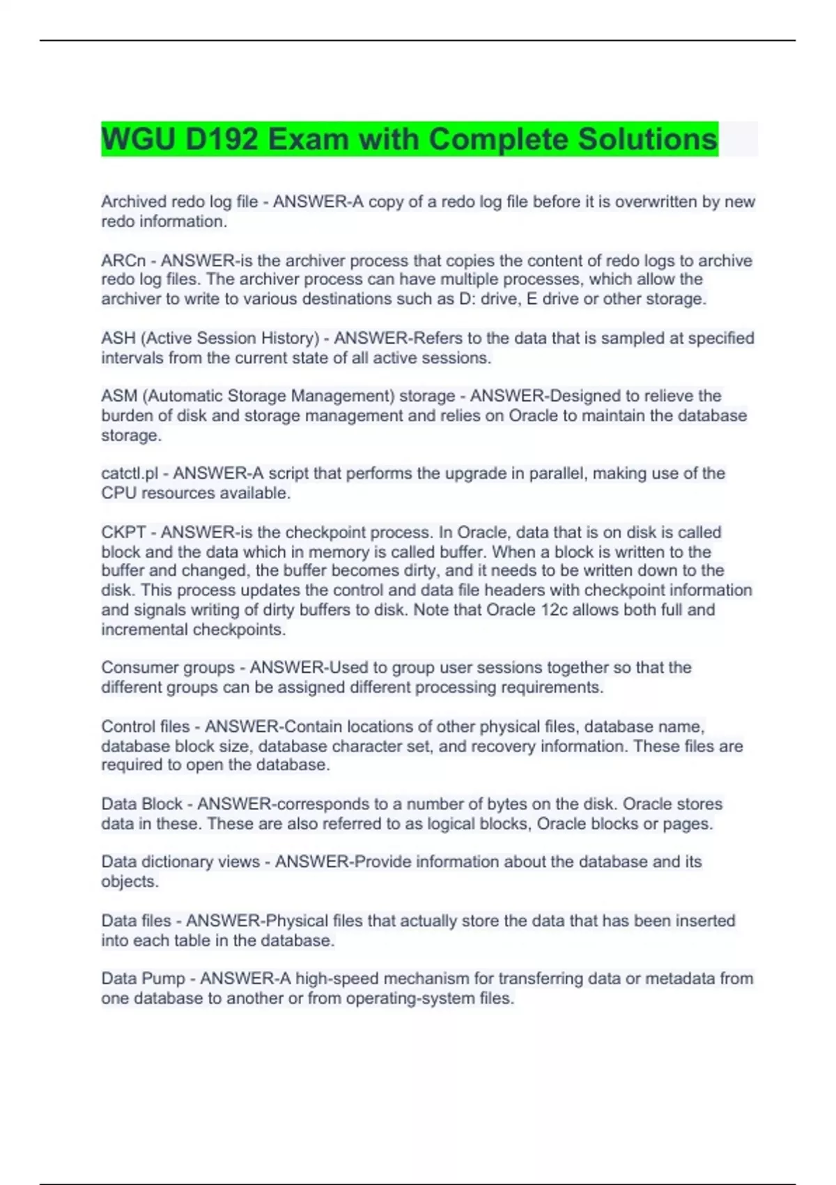 Which parameter can an administrator enable without restarting a database? - ANSWER-SGA_TARGET Which view displays database parameters and values modified using the SCOPE=SPFILE clause? - ANSWER-V$SPPARAMETER Which command performs a clean shutdown without waiting for clients to disconnect? - ANSWER-SHUTDOWN IMMEDIATE Which area is a member of the System Global Area (SGA)? - ANSWER-Java pool Which types of events are recorded in an alert log? - ANSWER-Tablespace creation Which initialization parameter sets the location of the alert log? - ANSWER-DIAGNOSTIC_DEST Where is the file located by default? - ANSWER-$ORACLE_HOME/NETWORK/ADMIN Which type of connection uses the Oracle Listener to communicate? - ANSWER-Client with database server What does the SERVER=DEDICATED element in a file associate with each client connection? - ANSWER-A committed server process Which net service naming method requires the client to use a fixed port number? - ANSWER-Host A database link named wgu2021 has been created to link to a remote object in the test database. The object is named employee and is owned by Scott. Which reference resolves to the remote object? - ANSWER-yee@wgu2021 Which information from a remote database is included in the configuration of a database link? - ANSWER-User name Which object can be added to an existing bigfile tablespace? - ANSWER-table data What is the purpose of the undo tablespace? - ANSWER-To facilitate the rollback of transactions