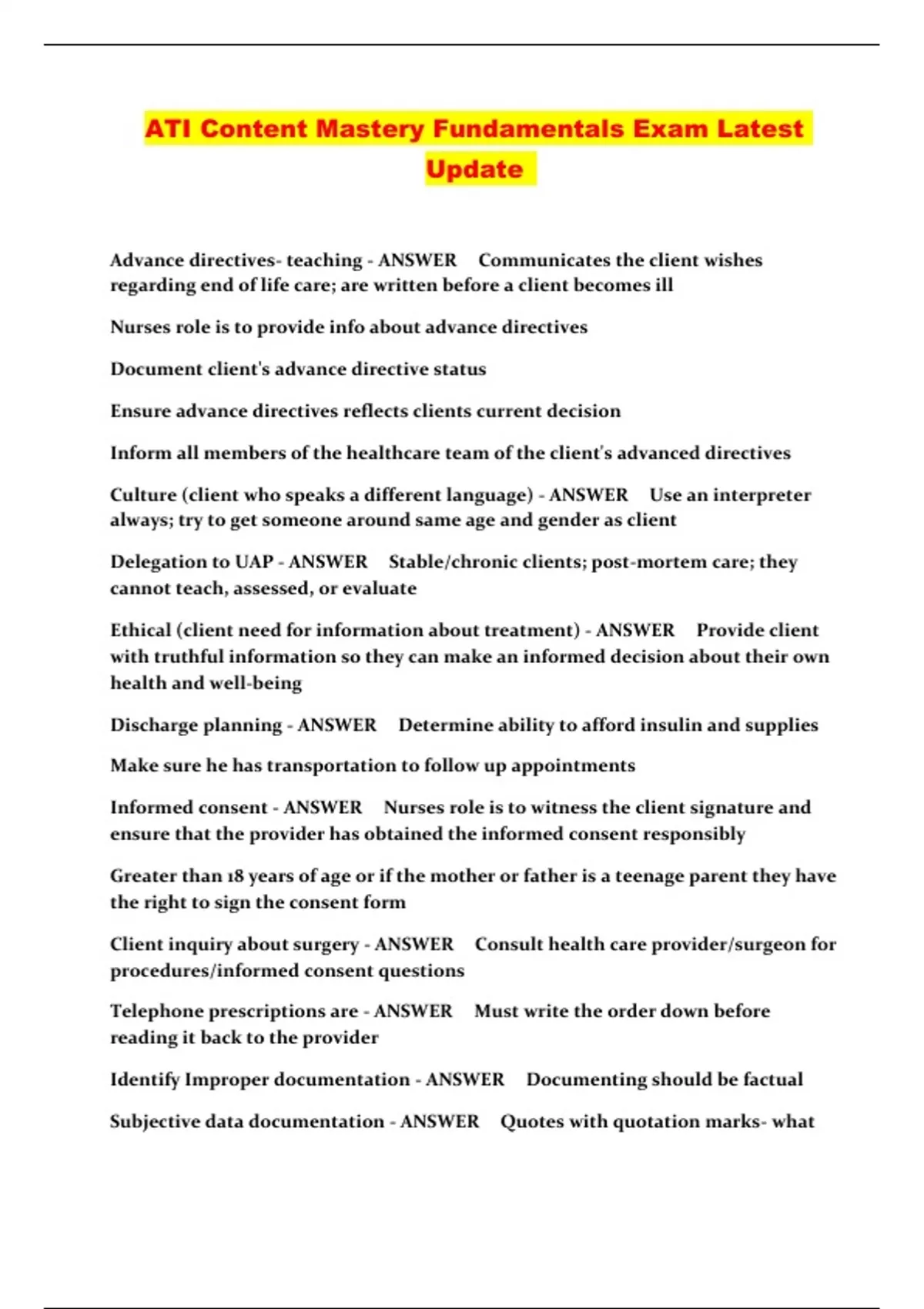 ATI Content Mastery Fundamentals Exam Latest Update