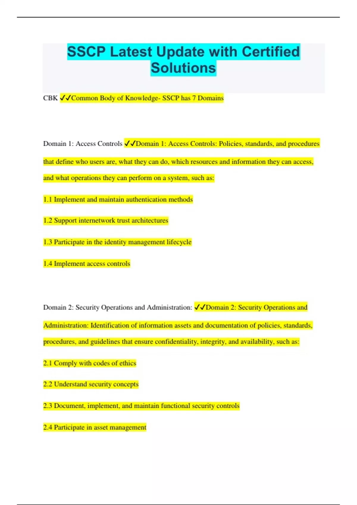 SSCP Latest Update with Certified Solutions CBK Common Body of Knowledge- SSCP has 7 Domains Domain 1: Access Controls Domain 1: Access Controls: Policies, standards, and procedures that define who users are, what they can do, which resources and information they can access, and what operations they can perform on a system, such as: 1.1 Implement and maintain authentication methods 1.2 Support internetwork trust architectures 1.3 Participate in the identity management lifecycle 1.4 Implement access controls Domain 2: Security Operations and Administration: Domain 2: Security Operations and Administration: Identification of information assets and documentation of policies, standards, procedures, and guidelines that ensure confidentiality, integrity, and availability, such as: 2.1 Comply with codes of ethics 2.2 Understand security concepts 2.3 Document, implement, and maintain functional security controls 2.4 Participate in asset management 2.5 Implement security controls and assess compliance 2.6 Participate in change management 2.7 Participate in security awareness and training 2.8 Participate in physical security operations (e.g., data center assessment, badging) Domain 3: Risk Identification, Monitoring, and Analysis Domain 3: Risk Identification, Monitoring, and Analysis: Risk identification is the review, analysis, and implementation of processes essential to the identification, measurement, and control of loss associated with unplanned adverse events. Monitoring and analysis are determining system implementation and access in accordance with defined IT criteria. This involves collecting information for identification of, and response to, security breaches or events, such as: 3.1 Understand the risk management process 3.2 Perform security assessment activities 3.3 Operate and maintain monitoring systems (e.g., continuous monitoring) 3.4 Analyze monitoring results Domain 4: Incident Response and Recovery Domain 4: Incident Response and Recovery: "The show must go on" is a well-known saying that means even if there are problems or difficulties, an event or activity must continue. Incident response and recovery ensures the work of the organization will continue. In this domain, the SSCP gains an understanding of how to handle incidents using consistent, applied approaches like business continuity planning (BCP) and disaster recovery planning (DRP). These approaches are utilized to mitigate damages, recover business operations, and avoid critical business interruption: 4.1 Support incident lifecycle 4.2 Understand and support forensic investigations 4.3 Understand and support business continuity plan (BCP) and disaster recovery plan (DRP) activities Domain 5: Cryptography Domain 5: Cryptography: The protection of information using techniques that ensure its integrity, confidentiality, authenticity, and nonrepudiation, and the recovery of encrypted information in its original form: 5.1 Understand fundamental concepts of cryptography 5.2 Understand reasons and requirements for cryptography 5.2 Understand and support secure protocols 5.2 Understand public key infrastructure (PKI) systems Domain 6: Network and Communications Security Domain 6: Network and Communications Security: The network structure, transmission methods and techniques, transport formats, and security measures used to operate both private and public communication networks: 6.1 Understand and apply fundamental concepts of networking 6.2