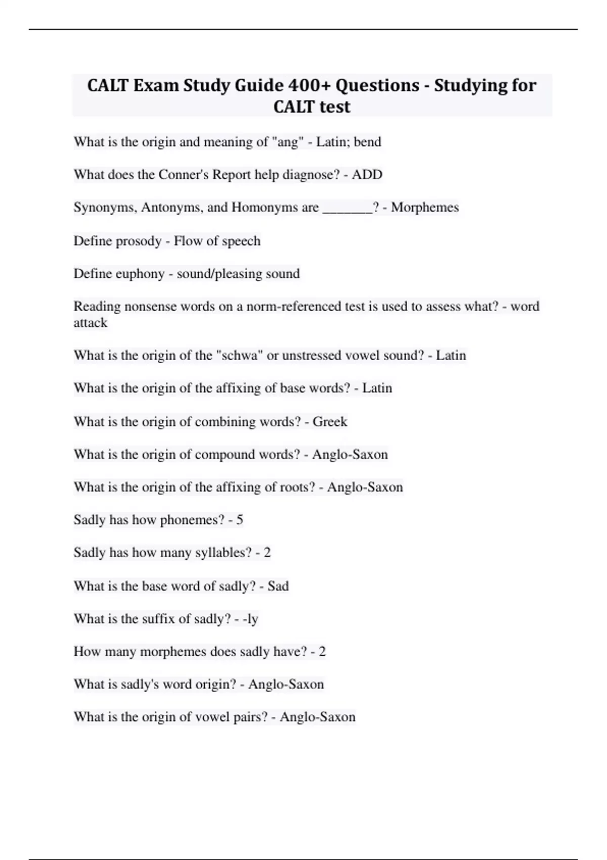 What is the origin and meaning of "ang" - Latin; bend What does the Conner's Report help diagnose? - ADD Synonyms, Antonyms, and Homonyms are _______? - Morphemes Define prosody - Flow of speech Define euphony - sound/pleasing sound Reading nonsense words on a norm-referenced test is used to assess what? - word attack What is the origin of the "schwa" or unstressed vowel sound? - Latin What is the origin of the affixing of base words? - Latin What is the origin of combining words? - Greek What is the origin of compound words? - Anglo-Saxon What is the origin of the affixing of roots? - Anglo-Saxon Sadly has how phonemes? - 5 Sadly has how many syllables? - 2 What is the base word of sadly? - Sad What is the suffix of sadly? - -ly How many morphemes does sadly have? - 2 What is sadly's word origin? - Anglo-Saxon What is the origin of vowel pairs? - Anglo-Saxon