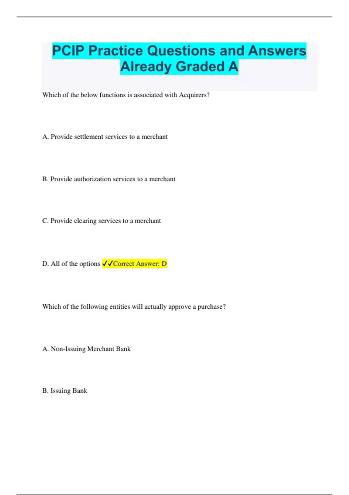 PCIP Practice Questions and Answers Already Graded A Which of the below functions is associated with Acquirers? A. Provide settlement services to a merchant B. Provide authorization services to a merchant C. Provide clearing services to a merchant D. All of the options Correct Answer: D Which of the following entities will actually approve a purchase? A. Non-Issuing Merchant Bank B. Issuing Bank C. Payment Transaction Gateway D. Acquiring Bank Correct Answer: B Which of the following lists the correct "order" for the flow of a payment card transaction? A. Clearing, Settlement, Authorization B. Clearing, Authorization, Settlement C. Authorization, Clearing, Settlement D. Authorization, Settlement, Clearing Correct Answer: C Service Providers include companies which_____________or could______________the security of cardholder data. A. are PCI compliant, prove effective controls for B. control, impact C. manage, test D. control, subrogate Correct Answer: B QUESTION 16 Cardholder Data may be stored in "KNOWN" and "UNKNOWN" locations. A. True B. False Correct Answer: A Storing Track Data "Long-Term" or "persistently" may be permitted if_______________. A. it is being stored by issuers B. it is reported to the PCI SSC annually in a RoC C. it is encrypted by the merchant storing it D. it