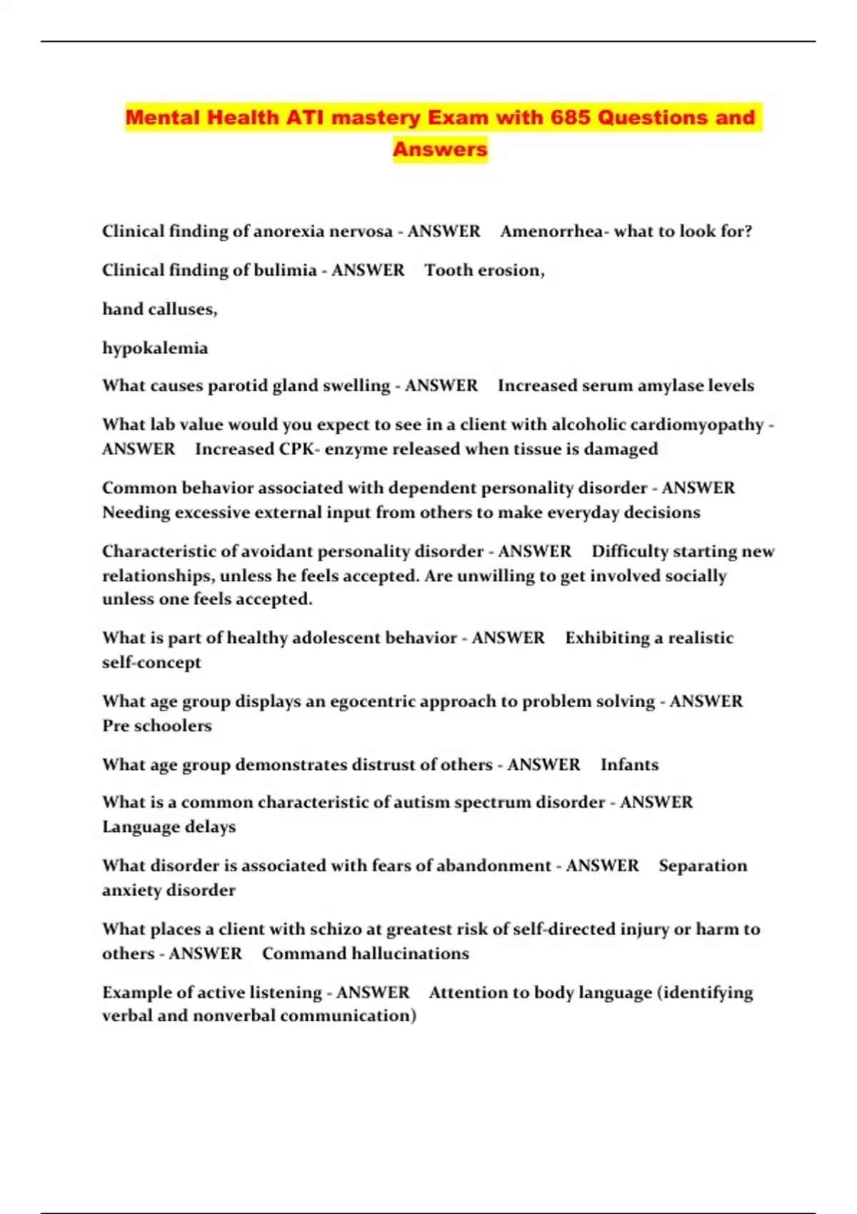 Mental Health ATI mastery Exam with 685 Questions and Answers...