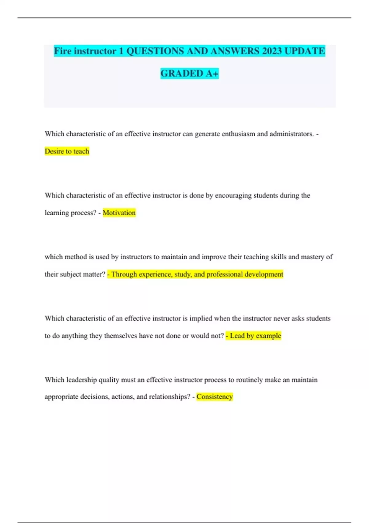 Which characteristic of an effective instructor can generate enthusiasm and administrators. - Desire to teach Which characteristic of an effective instructor is done by encouraging students during the learning process? - Motivation which method is used by instructors to maintain and improve their teaching skills and mastery of their subject matter? - Through experience, study, and professional development Which characteristic of an effective instructor is implied when the instructor never asks students to do anything they themselves have not done or would not? - Lead by example Which leadership quality must an effective instructor process to routinely make an maintain appropriate decisions, actions, and relationships? - Consistency
