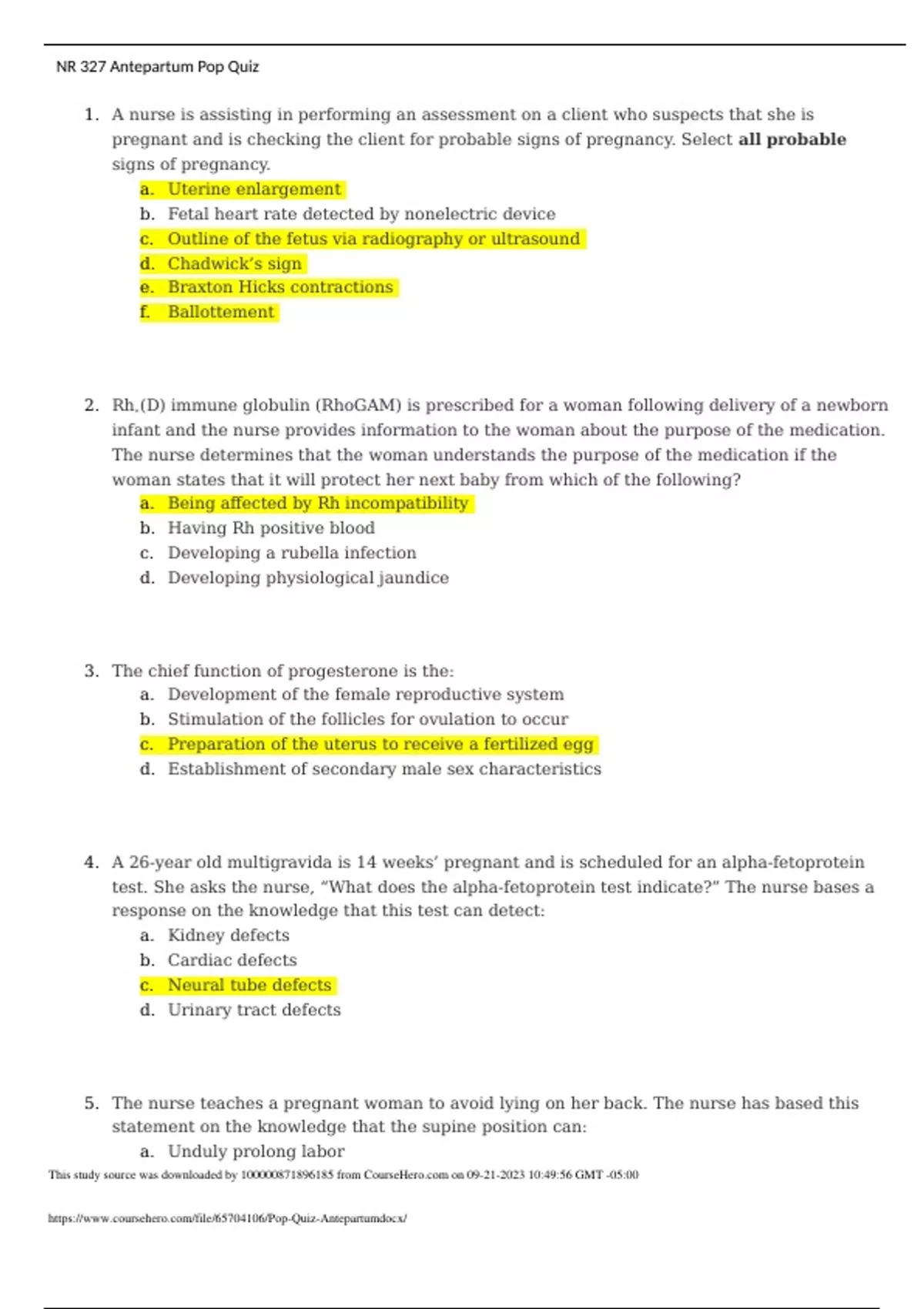 NR 327 Antepartum Pop Quiz 1. A nurse is assisting in performing an assessment on a client who suspects that she is pregnant and is checking the client for probable signs of pregnancy. Select all probable signs of pregnancy. a. Uterine enlargement b. Fetal heart rate detected by nonelectric device c. Outline of the fetus via radiography or ultrasound d. Chadwick’s sign e. Braxton Hicks contractions f. Ballottement 2. Rho (D) immune globulin (RhoGAM) is prescribed for a woman following delivery of a newborn infant and the nurse provides information to the woman about the purpose of the medication. The nurse determines that the woman understands the purpose of the medication if the woman states that it will protect her next baby from which of the following? a. Being affected by Rh incompatibility b. Having Rh positive blood c. Developing a rubella infection d. Developing physiological jaundice 3. The chief function of progesterone is the: a. Development of the female reproductive system