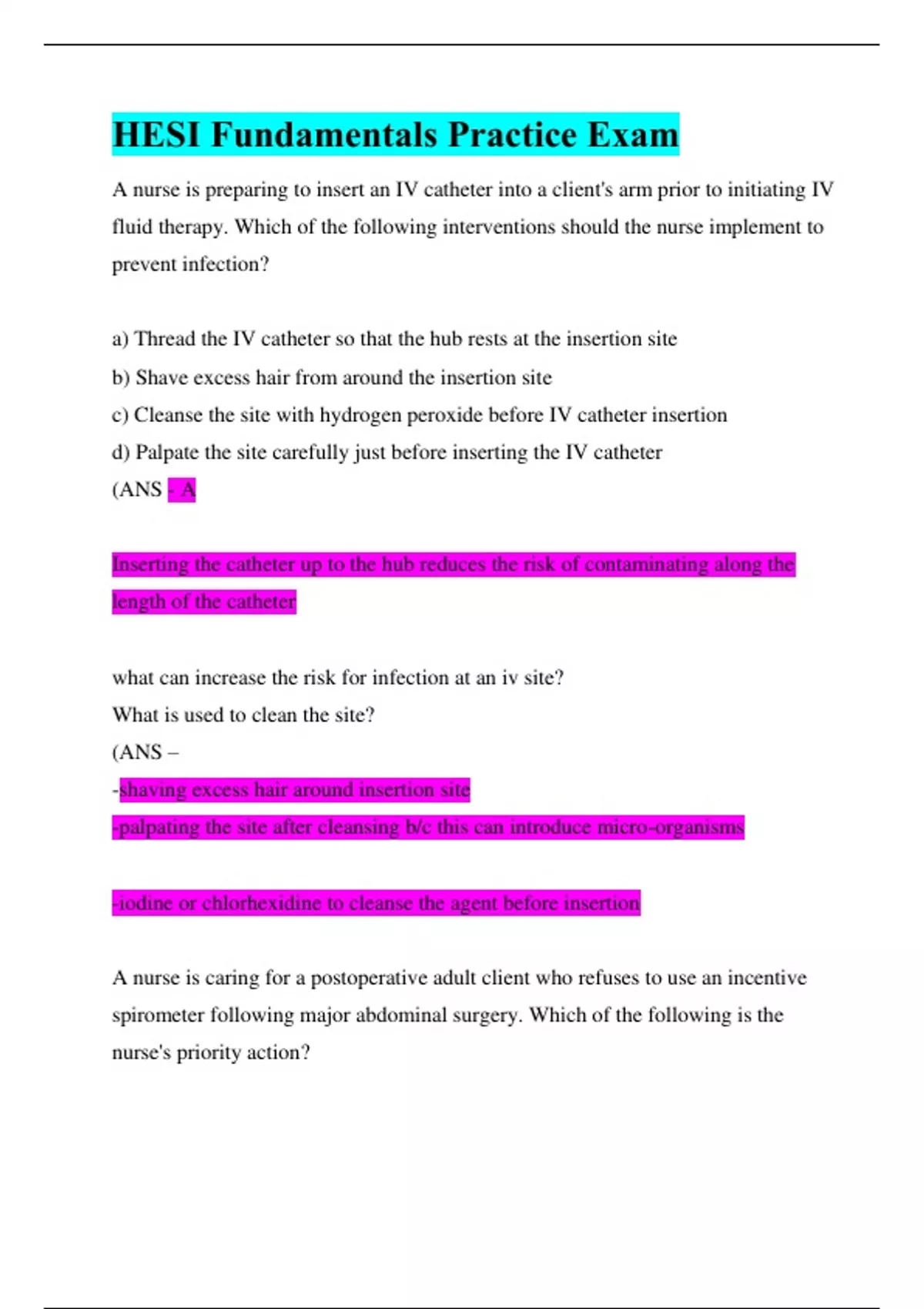 A nurse is preparing to insert an IV catheter into a client's arm prior to initiating IV fluid therapy. Which of the following interventions should the nurse implement to prevent infection? a) Thread the IV catheter so that the hub rests at the insertion site b) Shave excess hair from around the insertion site c) Cleanse the site with hydrogen peroxide before IV catheter insertion d) Palpate the site carefully just before inserting the IV catheter (ANS - A Inserting the catheter up to the hub reduces the risk of contaminating along the length of the catheter what can increase the risk for infection at an iv site? What is used to clean the site? (ANS – -shaving excess hair around insertion site -palpating the site after cleansing b/c this can introduce micro-organisms -iodine or chlorhexidine to cleanse the agent before insertion