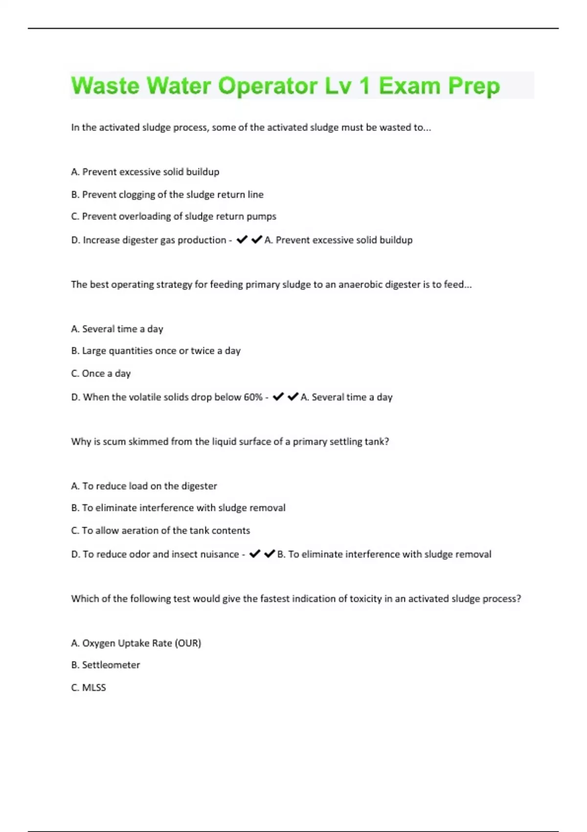In the activated sludge process, some of the activated sludge must be wasted to... A. Prevent excessive solid buildup B. Prevent clogging of the sludge return line C. Prevent overloading of sludge return pumps D. Increase digester gas production - A. Prevent excessive solid buildup The best operating strategy for feeding primary sludge to an anaerobic digester is to feed... A. Several time a day B. Large quantities once or twice a day C. Once a day D. When the volatile solids drop below 60% - A. Several time a day Why is scum skimmed from the liquid surface of a primary settling tank? A. To reduce load on the digester B. To eliminate interference with sludge removal C. To allow aeration of the tank contents D. To reduce odor and insect nuisance - B. To eliminate interference with sludge removal Which of the following test would give the fastest indication of toxicity in an activated sludge process? A. Oxygen Uptake Rate (OUR) B. Settleometer C. MLSSD. Microscopic Observation - A. Oxygen Uptake Rate (OUR) Filamentous bulking of activated sludge may be controlled temporarily by... A. Adding sodium chloride to the aeration tank B. Spraying water on the aeration tank surface C. Carefully chlorinating the return sludge and mixed liquor D. Aerating the final settling tank - C. Carefully chlorinating the return sludge and mixed liquor