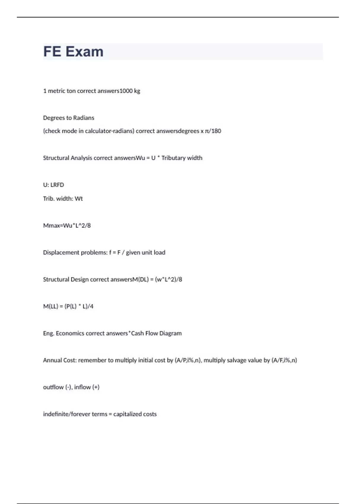 1 metric ton correct answers1000 kg Degrees to Radians (check mode in calculator-radians) correct answersdegrees x π/180 Structural Analysis correct answersWu = U * Tributary width U: LRFD Trib. width: Wt Mmax=Wu*L^2/8 Displacement problems: f = F / given unit load Structural Design correct answersM(DL) = (w*L^2)/8 M(LL) = (P(L) * L)/4 Eng. Economics correct answers*Cash Flow Diagram Annual Cost: remember to multiply initial cost by (A/P,i%,n), multiply salvage value by (A/F,i%,n) outflow (-), inflow (+) indefinite/forever terms = capitalized costs