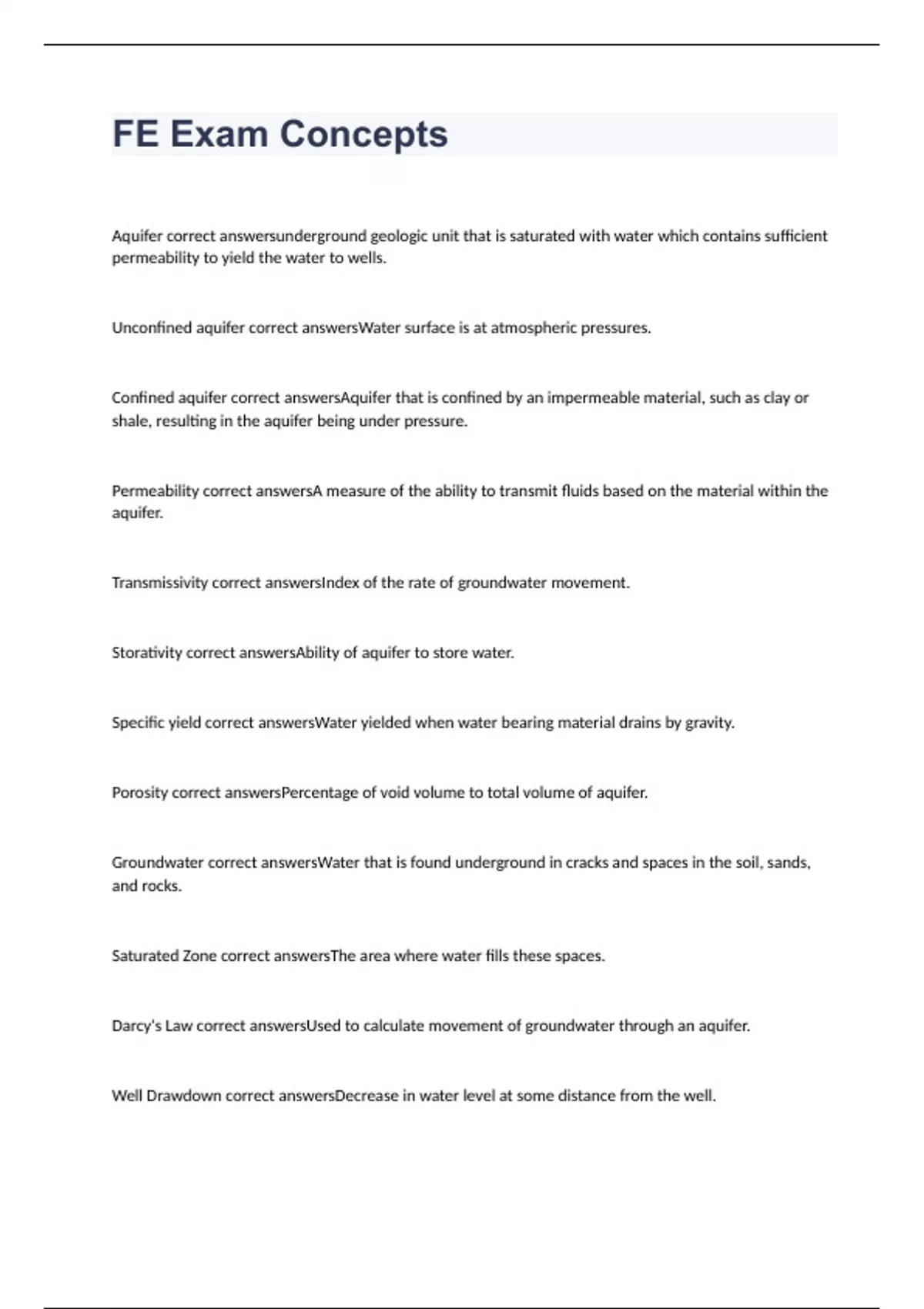Aquifer correct answersunderground geologic unit that is saturated with water which contains sufficient permeability to yield the water to wells. Unconfined aquifer correct answersWater surface is at atmospheric pressures. Confined aquifer correct answersAquifer that is confined by an impermeable material, such as clay or shale, resulting in the aquifer being under pressure. Permeability correct answersA measure of the ability to transmit fluids based on the material within the aquifer. Transmissivity correct answersIndex of the rate of groundwater movement. Storativity correct answersAbility of aquifer to store water. Specific yield correct answersWater yielded when water bearing material drains by gravity. Porosity correct answersPercentage of void volume to total volume of aquifer. Groundwater correct answersWater that is found underground in cracks and spaces in the soil, sands, and rocks. Saturated Zone correct answersThe area where water fills these spaces. Darcy's Law correct answersUsed to calculate movement of groundwater through an aquifer. Well Drawdown correct answersDecrease in water level at some distance from the well.