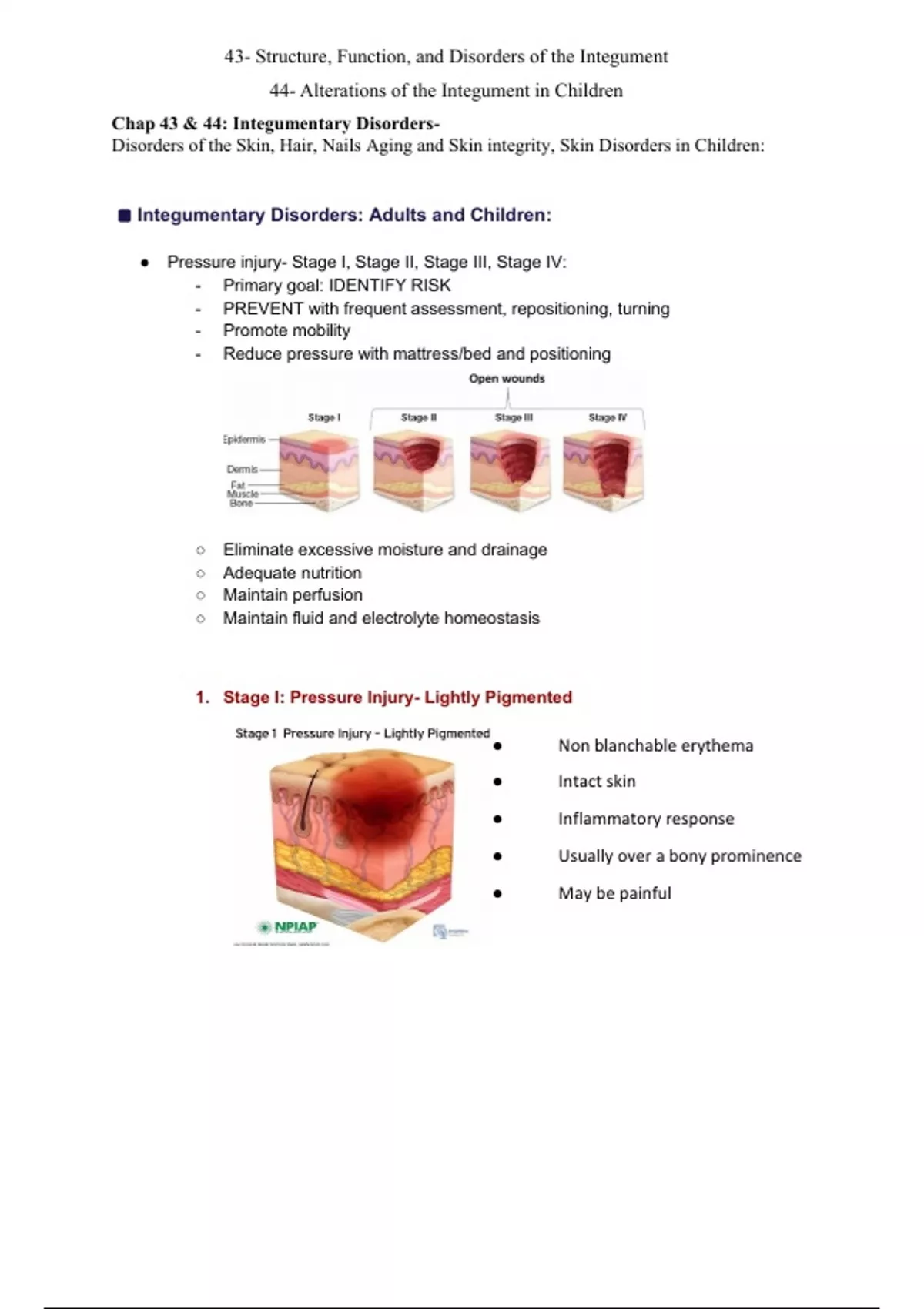 Integumentary Disorders: Adults and Children: ● Pressure injury- Stage I, Stage II, Stage III, Stage IV: - Primary goal: IDENTIFY RISK - PREVENT with frequent assessment, repositioning, turning - Promote mobility - Reduce pressure with mattress/bed and positioning ○ Eliminate excessive moisture and drainage ○ Adequate nutrition ○ Maintain perfusion ○ Maintain fluid and electrolyte homeostasis