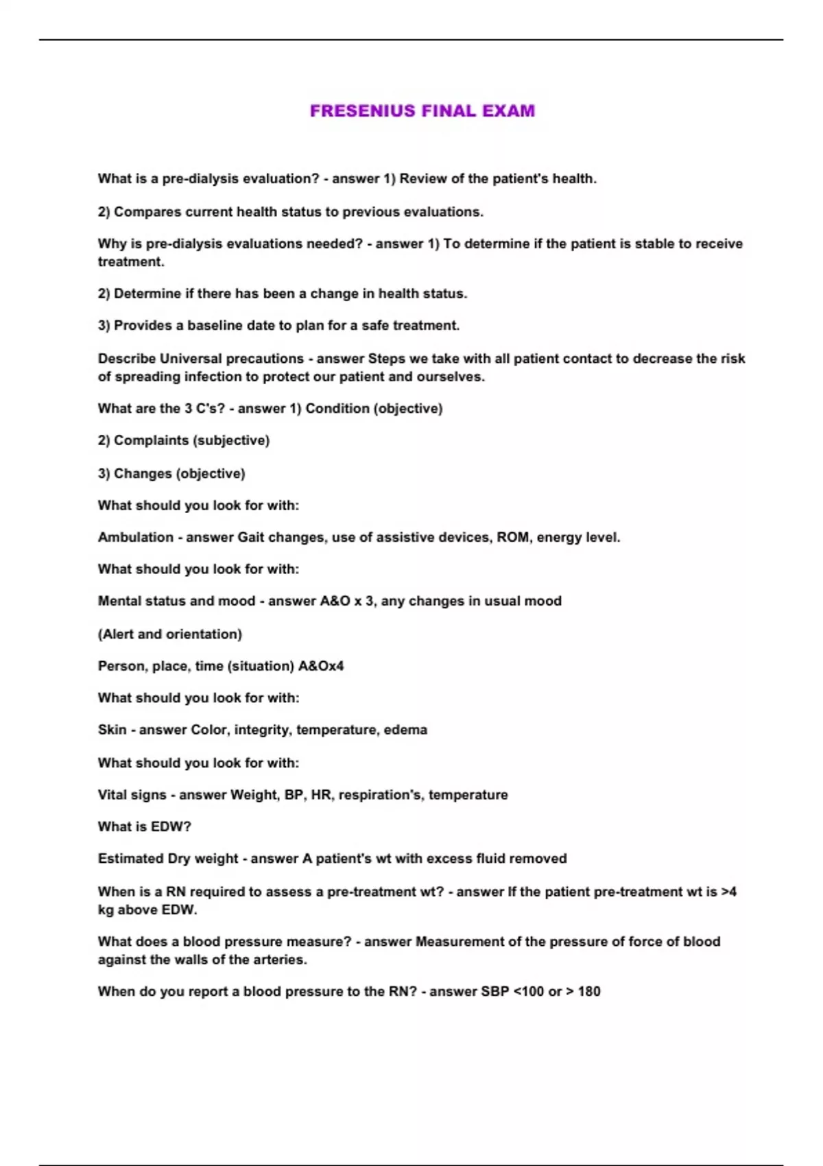 What is a pre-dialysis evaluation? - answer 1) Review of the patient's health. 2) Compares current health status to previous evaluations. Why is pre-dialysis evaluations needed? - answer 1) To determine if the patient is stable to receive treatment. 2) Determine if there has been a change in health status. 3) Provides a baseline date to plan for a safe treatment. Describe Universal precautions - answer Steps we take with all patient contact to decrease the risk of spreading infection to protect our patient and ourselves. What are the 3 C's? - answer 1) Condition (objective) 2) Complaints (subjective) 3) Changes (objective) What should you look for with: Ambulation - answer Gait changes, use of assistive devices, ROM, energy level. What should you look for with: Mental status and mood - answer A&O x 3, any changes in usual mood (Alert and orientation) Person, place, time (situation) A&Ox4 What should you look for with: Skin - answer Color, integrity, temperature, edema What should you look for with: Vital signs - answer Weight, BP, HR, respiration's, temperature
