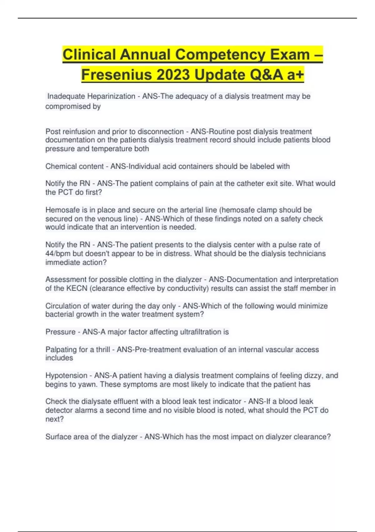 nadequate Heparinization - ANS-The adequacy of a dialysis treatment may be compromised by Post reinfusion and prior to disconnection - ANS-Routine post dialysis treatment documentation on the patients dialysis treatment record should include patients blood pressure and temperature both Chemical content - ANS-Individual acid containers should be labeled with Notify the RN - ANS-The patient complains of pain at the catheter exit site. What would the PCT do first? Hemosafe is in place and secure on the arterial line (hemosafe clamp should be secured on the venous line) - ANS-Which of these findings noted on a safety check would indicate that an intervention is needed