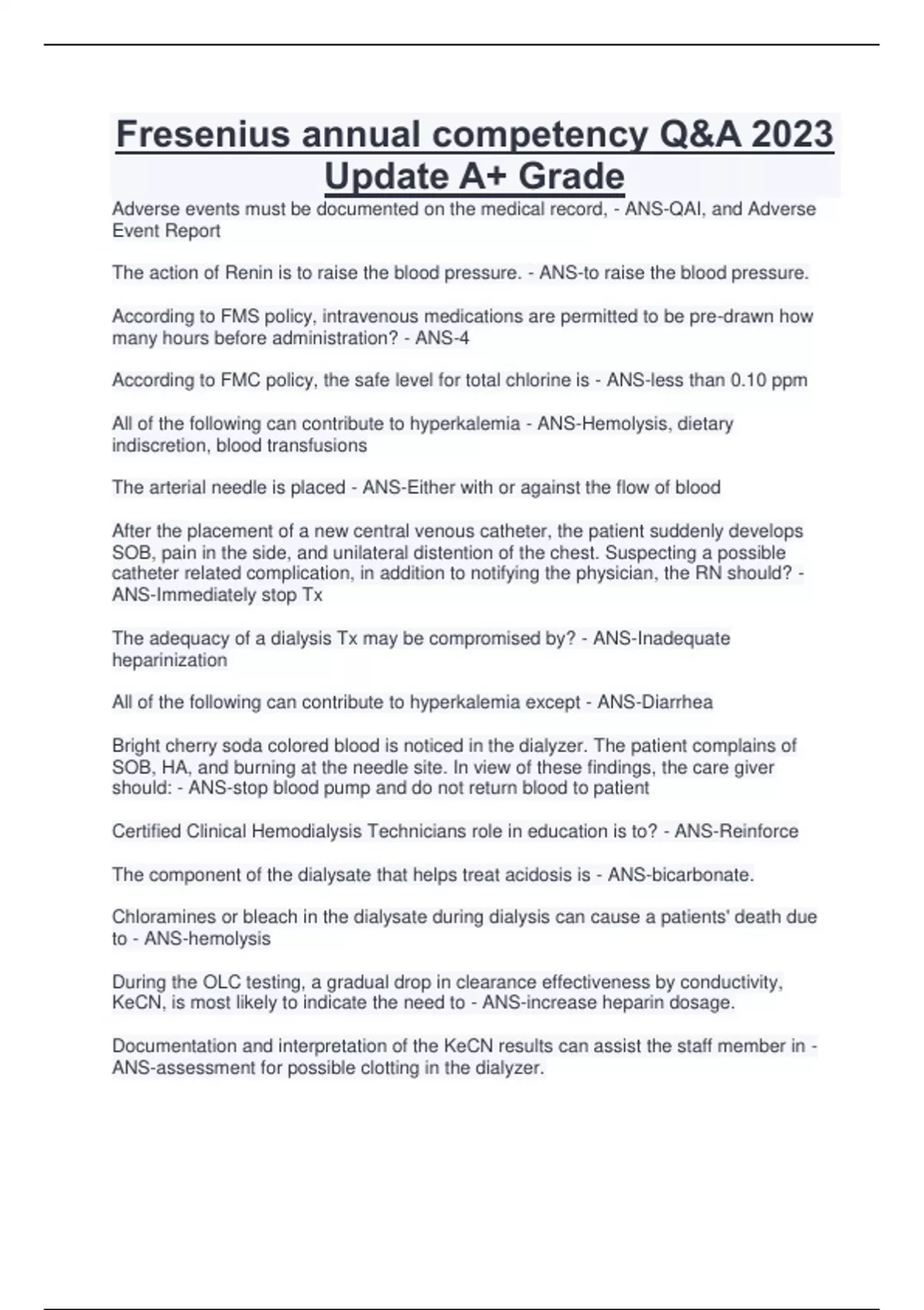 Adverse events must be documented on the medical record, - ANS-QAI, and Adverse Event Report The action of Renin is to raise the blood pressure. - ANS-to raise the blood pressure. According to FMS policy, intravenous medications are permitted to be pre-drawn how many hours before administration? - ANS-4 According to FMC policy, the safe level for total chlorine is - ANS-less than 0.10 ppm All of the following can contribute to hyperkalemia - ANS-Hemolysis, dietary indiscretion, blood transfusions The arterial needle is placed - ANS-Either with or against the flow of blood After the placement of a new central venous catheter, the patient suddenly develops SOB, pain in the side, and unilateral distention of the chest. Suspecting a possible catheter related complication, in addition to notifying the physician, the RN should? - ANS-Immediately stop Tx The adequacy of a dialysis Tx may be compromised by? - ANS-Inadequate heparinization All of the following can contribute to hyperkalemia except - ANS-Diarrhea Bright cherry soda colored blood is noticed in the dialyzer. The patient complains of SOB, HA, and burning at the needle site. In view of these findings, the care giver should: - ANS-stop blood pump and do not return blood to p