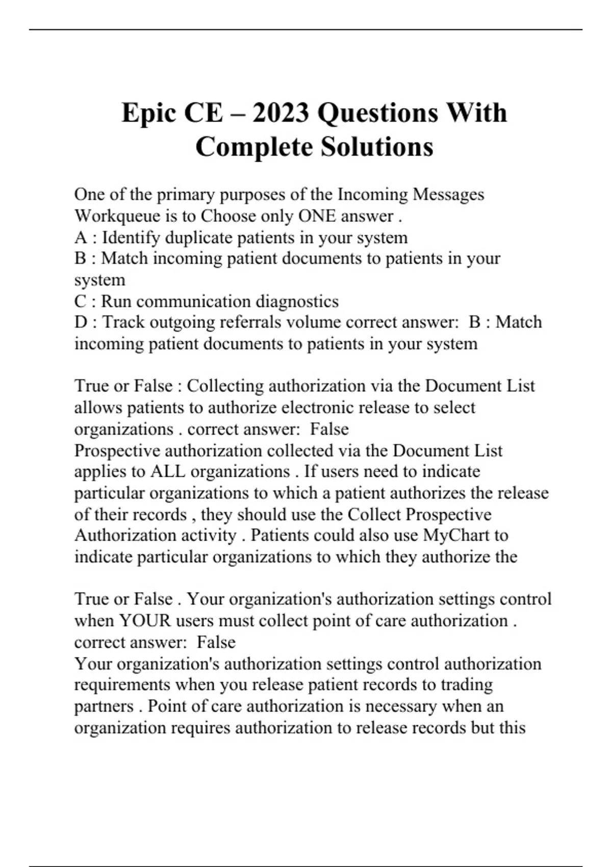 One of the primary purposes of the Incoming Messages Workqueue is to Choose only ONE answer . A : Identify duplicate patients in your system B : Match incoming patient documents to patients in your system C : Run communication diagnostics D : Track outgoing referrals volume correct answer: B : Match incoming patient documents to patients in your system True or False : Collecting authorization via the Document List allows patients to authorize electronic release to select organizations . correct answer: False Prospective authorization collected via the Document List applies to ALL organizations . If users need to indicate particular organizations to which a patient authorizes the release of their records , they should use the Collect Prospective Authorization activity . Patients could also use MyChart to indicate particular organizations to which they authorize the True or False . Your organization's authorization settings control when YOUR users must collect point of care authorization . correct answer: False Your organization's authorization settings control authorization requirements when you release patient records to trading partners . Point of care authorization is necessary when an organization requires authorization to release records but this authorization is not yet collected when the patient arrives at the trading partner . Your authorization settings and rate of prospective authorization collection impact how frequently trading partners need to collect point of care authorization . Pluto Health and Venus Health are both Epic organizations and both always require authorization to send patient documents via Care Everywhere . Saturn Health is also an Epic organization never requires authorization . Part 1 : True or False : Users at Saturn must collect prospective authorization from patients to ensure that users at Pluto and Venus will NOT have to collect point of care authorization when querying Saturn . correct answer: False Users at Saturn do not need to collect prospective authorization because Saturn does NOT require authorization from their patients to release records . Pluto Health and Venus Health are both Epic organizations and both always require authorization to send patient documents via Care Everywhere . Saturn Health is also an Epic organization never requires authorization . Part II : True or False : If users at Pluto collect prospective authorization , then users at Saturn will NOT have to collect point of care authorization when querying Pluto . correct answer: True By collecting prospective authorization from their patients , Pluto users have satisfied their organization's authorization requirement to send their patients ' records via Care Everywhere An outside provider sent a referral via Direct messaging to Dr. Kristina at your organization . But Dr. Kristina does not see the outside message in her In Basket . Which of the following COULD be the cause ? Choose ALL answers that apply A : Your organization may have configured the Direct Routing Table to send referrals from outside organizations to an in Basket pool . B : Your organization has not loaded the outside organization's most recent provider directory . C : The referral may be for a patient who does not yet have a Patient ( EPT ) record at your organization . D: The outside organization has not loaded their own most recent provider directory . correct answer: A : Your organization may have configured the Direct Routing Table to send referrals from outside organizations to an in Basket pool . C : The referral may be for a patient who does not yet have a Patient ( EPT ) record at your organization . B is not correct because if your organization does not have current Direct addresses for providers at the outside organization , then Dr. Kristina cannot SEND Direct messages to them . D is not correct because as long as the outside organization has received and loaded YOUR organizatio