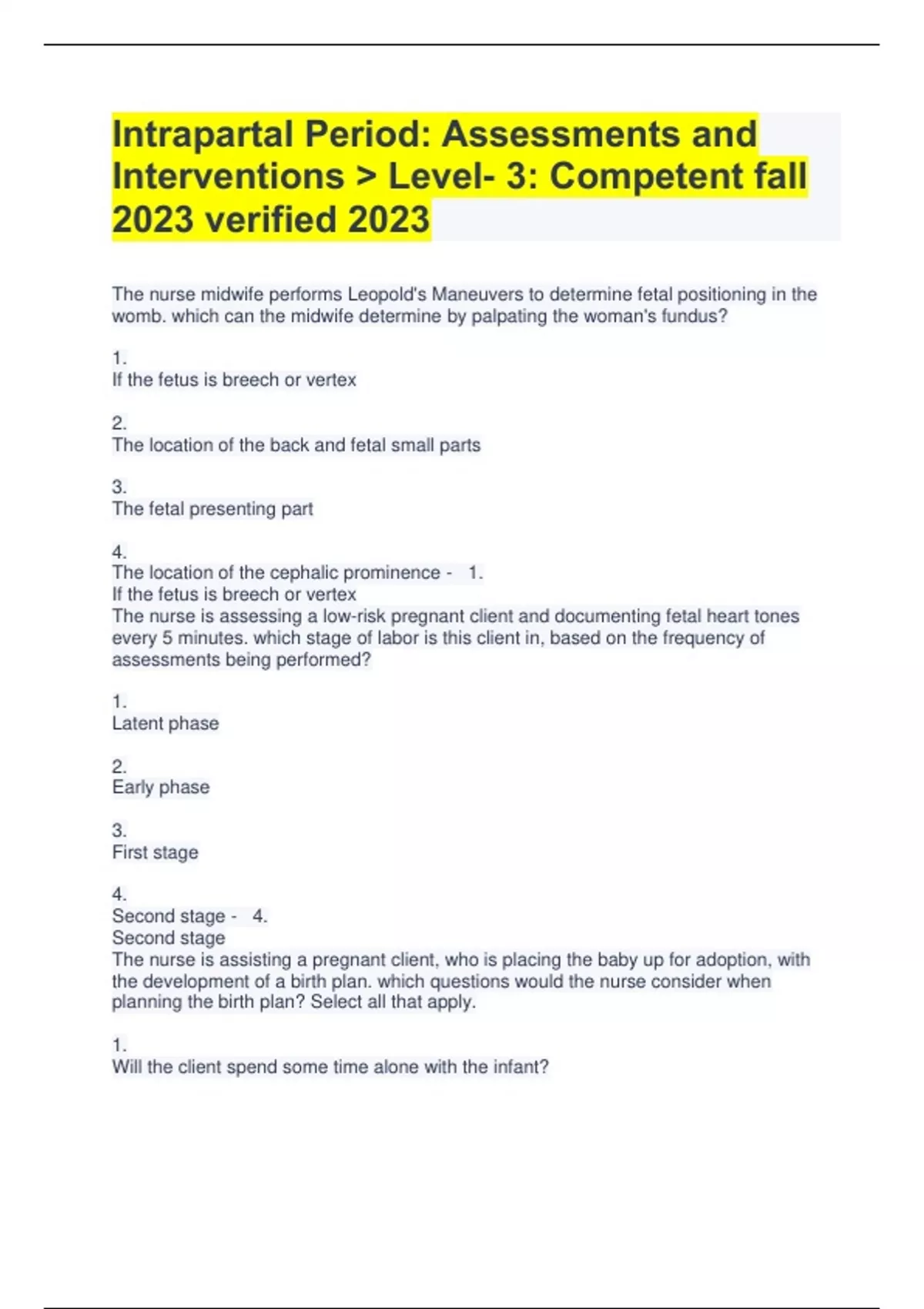 Intrapartal Period: Assessments and Interventions > Level- 3: Competent fall 2023 verified 2023 The nurse midwife performs Leopold's Maneuvers to determine fetal positioning in the womb. which can the midwife determine by palpating the woman's fundus? 1. If the fetus is breech or vertex 2. The location of the back and fetal small parts 3. The fetal presenting part 4. The location of the cephalic prominence - 1. If the fetus is breech or vertex The nurse is assessing a low-risk pregnant client and documenting fetal heart tones every 5 minutes. which stage of labor is this client in, based on the frequency of assessments being performed? 1. Latent phase 2. Early phase 3. First stage 4. Second stage - 4. Second stage The nurse is assisting a pregnant client, who is placing the baby up for adoption, with the development of a birth plan. which questions would the nurse consider when planning the birth plan? Select all that apply. 1. Will the client spend some time alone with the infant?