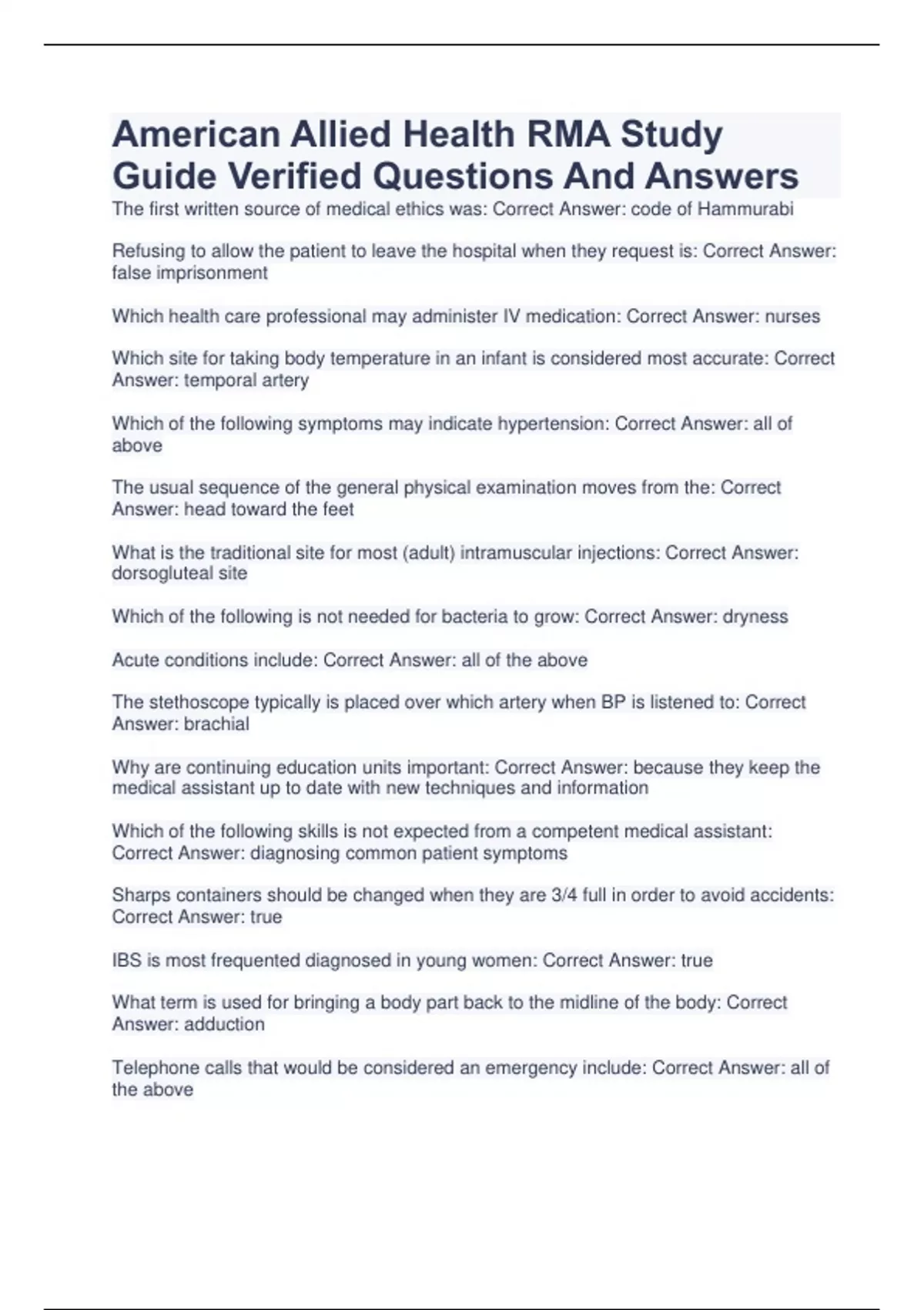 American Allied Health RMA Study Guide Verified Questions And Answers