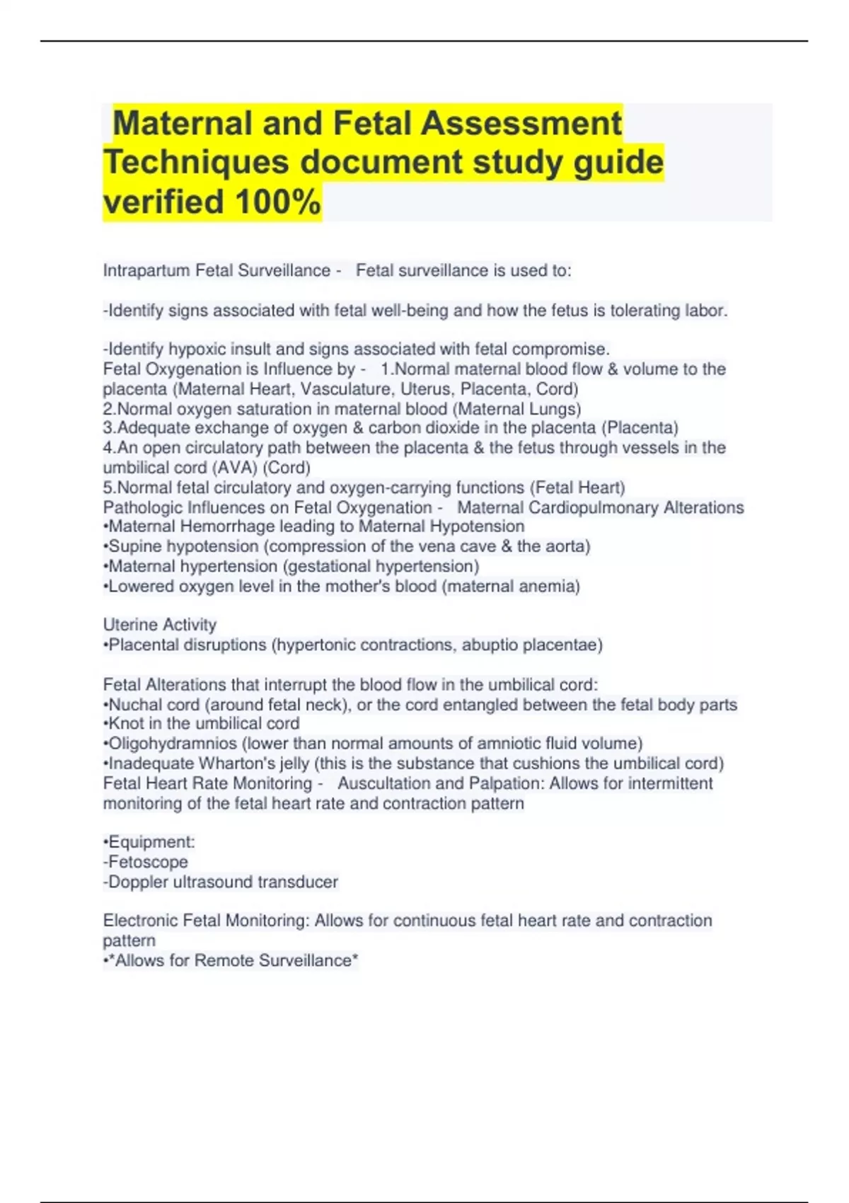 Maternal and Fetal Assessment Techniques document study guide verified 100% Intrapartum Fetal Surveillance - Fetal surveillance is used to: -Identify signs associated with fetal well-being and how the fetus is tolerating labor. -Identify hypoxic insult and signs associated with fetal compromise. Fetal Oxygenation is Influence by - 1.Normal maternal blood flow & volume to the placenta (Maternal Heart, Vasculature, Uterus, Placenta, Cord) 2.Normal oxygen saturation in maternal blood (Maternal Lungs) 3.Adequate exchange of oxygen & carbon dioxide in the placenta (Placenta) 4.An open circulatory path between the placenta & the fetus through vessels in the umbilical cord (AVA) (Cord) 5.Normal fetal circulatory and oxygen-carrying functions (Fetal Heart) Pathologic Influences on Fetal Oxygenation - Maternal Cardiopulmonary Alterations •Maternal Hemorrhage leading to Maternal Hypotension •Supine hypotension (compression of the vena cave & the aorta) •Maternal hypertension (gestational hypertension) •Lowered oxygen level in the mother's blood (maternal anemia) Uterine Activity •Placental disruptions (hypertonic contractions, abuptio placentae) Fetal Alterations that interrupt the blood flow in the umbilical cord: •Nuchal cord (around fetal neck), or the cord entangled between the fetal body parts •Knot in the umbilical cord •Oligohydramnios (lower than normal amounts of amniotic fluid volume) •Inadequate Wharton's jelly (this is the substance that cushions the umbilical cord) Fetal Heart Rate Monitoring - Auscultation and Palpation: Allows for intermittent monitoring of the fetal heart rate and contraction pattern •Equipment: -Fetoscope -Doppler ultrasound transducer Electronic Fetal Monitoring: Allows for continuous fetal heart rate and contraction pattern •*Allows for Remote Surveillance* *The Fetal Heart Rate