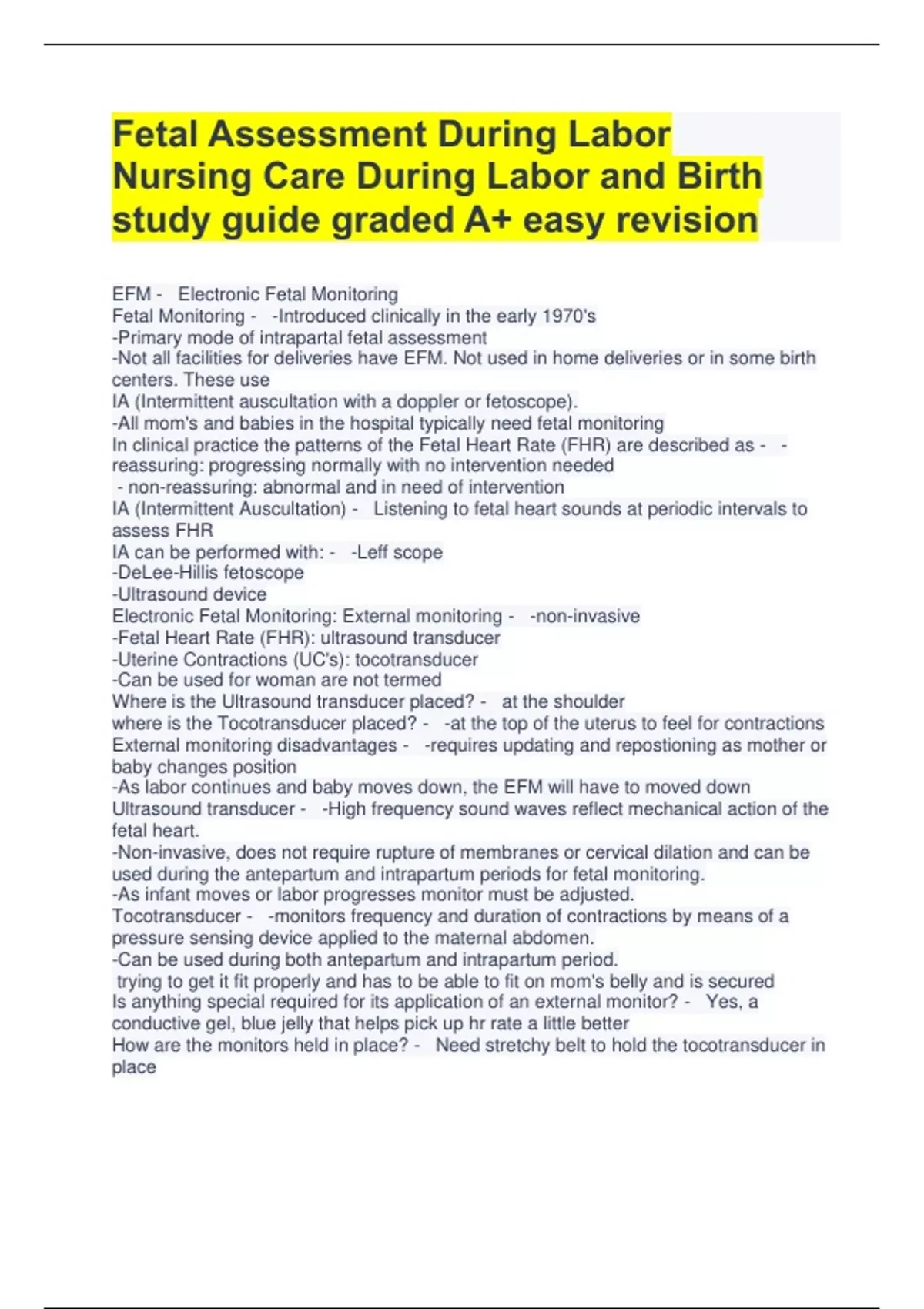 Fetal Assessment During Labor Nursing Care During Labor and Birth study guide graded A+ easy revision EFM - Electronic Fetal Monitoring Fetal Monitoring - -Introduced clinically in the early 1970's -Primary mode of intrapartal fetal assessment -Not all facilities for deliveries have EFM. Not used in home deliveries or in some birth centers. These use IA (Intermittent auscultation with a doppler or fetoscope). -All mom's and babies in the hospital typically need fetal monitoring In clinical practice the patterns of the Fetal Heart Rate (FHR) are described as - -reassuring: progressing normally with no intervention needed - non-reassuring: abnormal and in need of intervention IA (Intermittent Auscultation) - Listening to fetal heart sounds at periodic intervals to assess FHR IA can be performed with: - -Leff scope -DeLee-Hillis fetoscope -Ultrasound device Electronic Fetal Monitoring: External monitoring - -non-invasive -Fetal Heart Rate (FHR): ultrasound transducer -Uterine Contractions (UC's): tocotransducer -Can be used for woman are not termed Where is the Ultrasound transducer placed? - at the shoulder where is the Tocotransducer placed? - -at the top of the uterus to feel for contractions External monitoring disadvantages - -requires updating and repostioning as mother or baby changes position -As labor continues and baby moves down, the EFM will have to moved down Ultrasound transducer - -High frequency sound waves reflect mechanical action of the fetal heart. -Non-invasive, does not require rupture of membranes or cervical dilation and can be used during the antepartum and intrapartum periods for fetal monitoring. -As infant moves or labor progresses monitor must be adjusted. Tocotransducer - -monitors frequency and duration of contractions by means of a pressure sensing device applied to the maternal abdomen. -Can be used during both antepartum and intrapartum period. trying to get it fit properly and has to be able to fit on mom's belly and is secured Is anything special required for its applicatio