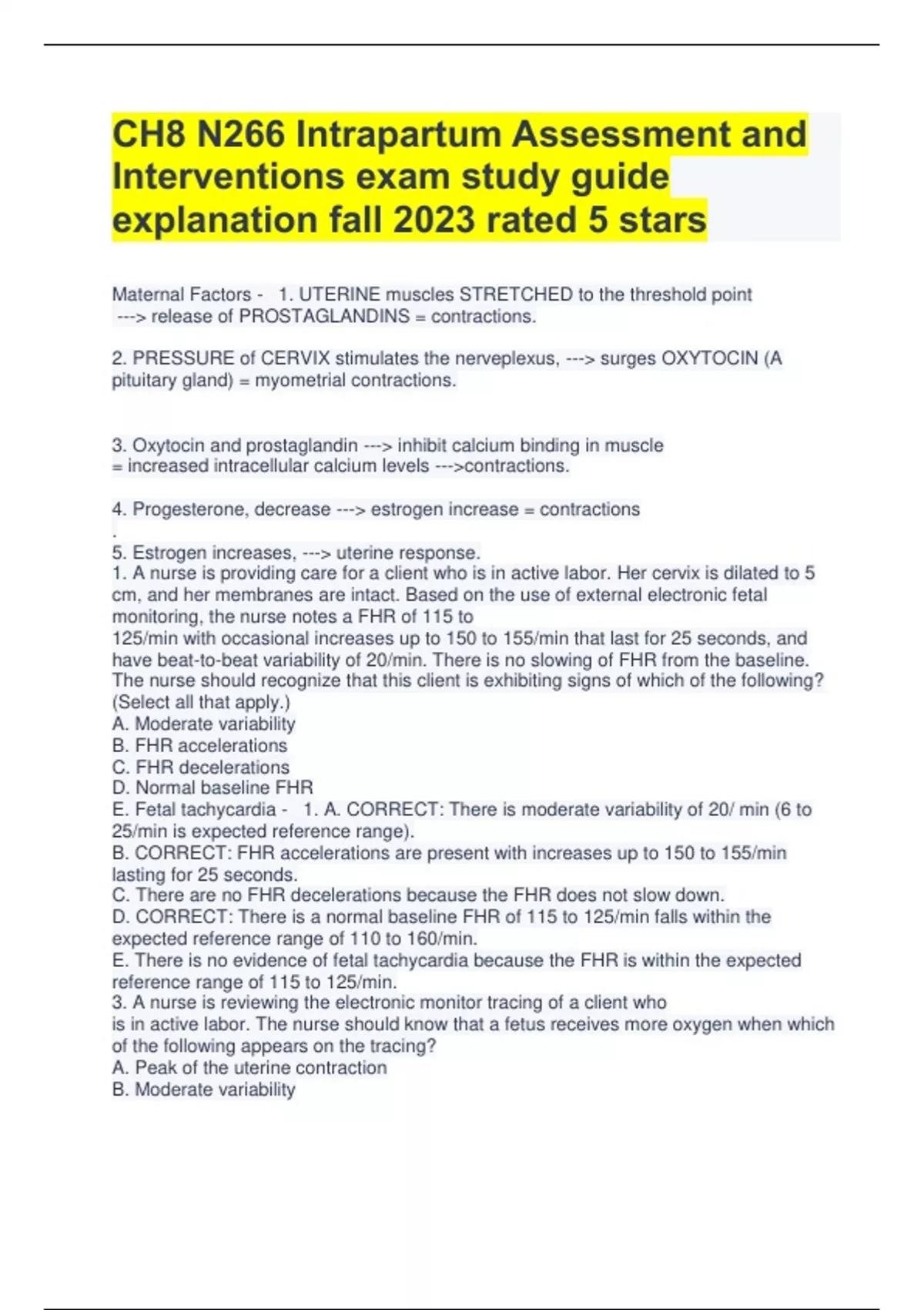 CH8 N266 Intrapartum Assessment and Interventions exam study guide explanation fall 2023 rated 5 stars Maternal Factors - 1. UTERINE muscles STRETCHED to the threshold point ---> release of PROSTAGLANDINS = contractions. 2. PRESSURE of CERVIX stimulates the nerveplexus, ---> surges OXYTOCIN (A pituitary gland) = myometrial contractions. 3. Oxytocin and prostaglandin ---> inhibit calcium binding in muscle = increased intracellular calcium levels --->contractions. 4. Progesterone, decrease ---> estrogen increase = contractions . 5. Estrogen increases, ---> uterine response. 1. A nurse is providing care for a client who is in active labor. Her cervix is dilated to 5 cm, and her membranes are intact. Based on the use of external electronic fetal monitoring, the nurse notes a FHR of 115 to 125/min with occasional increases up to 150 to 155/min that last for 25 seconds, and have beat-to-beat variability of 20/min. There is no slowing of FHR from the baseline. The nurse should recognize that this client is exhibiting signs of which of the following? (Select all that apply.) A. Moderate variability B. FHR accelerations C. FHR decelerations D. Normal baseline FHR E. Fetal tachycardia - 1. A. CORRECT: There is moderate variability of 20/ min (6 to 25/min is expected reference range). B. CORRECT: FHR accelerations are present with increases up to 150 to 155/min lasting for 25 seconds. C. There are no FHR decelerations because the FHR does not slow down. D. CORRECT: There is a normal baseline FHR of 115 to 125/min falls within the expected reference range of 110 to 160/min. E. There is no evidence of fetal tachycardia because the FHR is within the expected reference range of 115 to 125/min. 3. A nurse is reviewing the electronic monitor tracing of a client who is in active labor. The nurse should know that a fetus receives more oxygen when which of the following appears on the tracing? A. Peak of the uterine contraction B. Moderate variability C. FHR acceleration D. Relaxation between uterine c