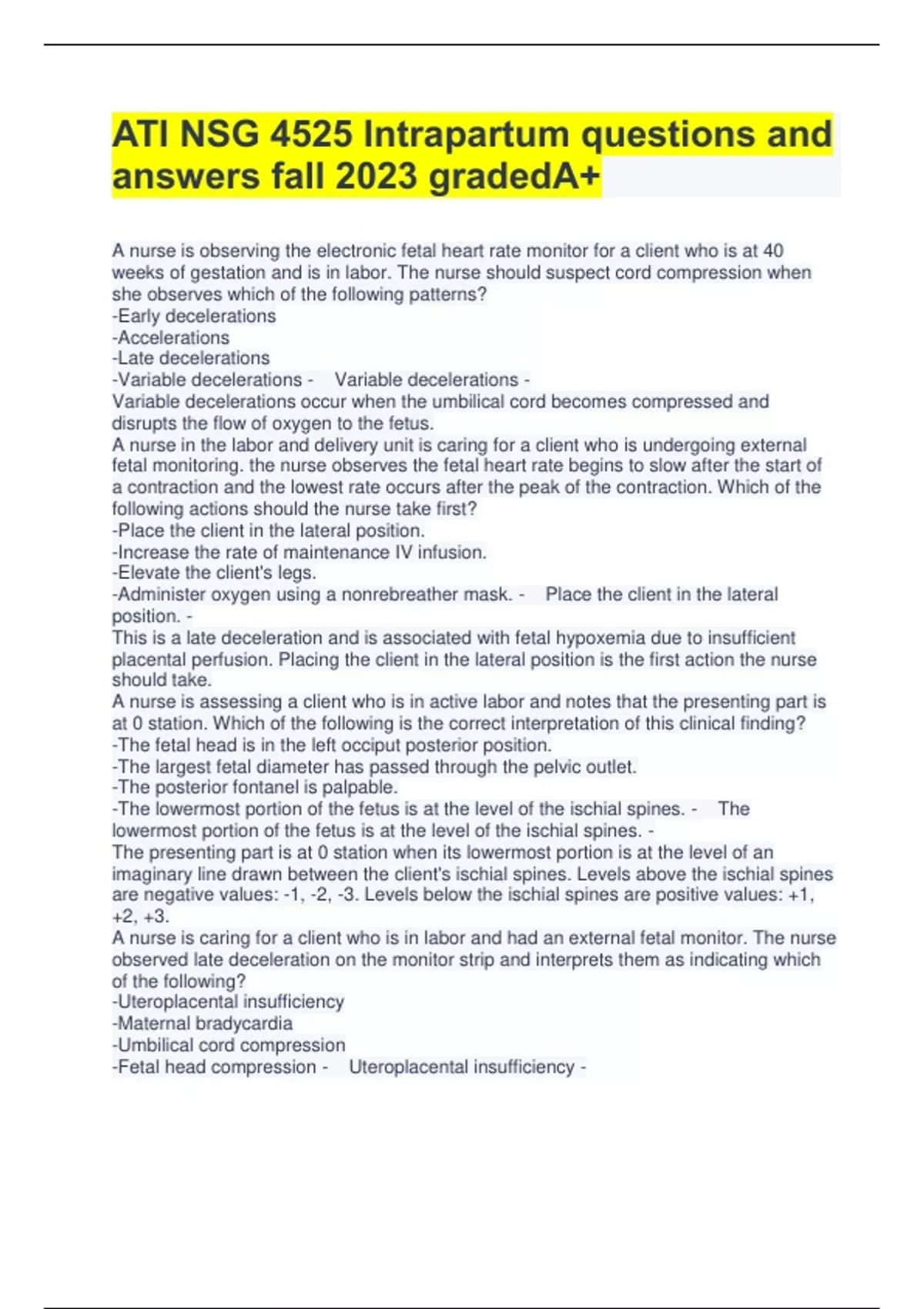 ATI NSG 4525 Intrapartum questions and answers fall 2023 gradedA+ A nurse is observing the electronic fetal heart rate monitor for a client who is at 40 weeks of gestation and is in labor. The nurse should suspect cord compression when she observes which of the following patterns? -Early decelerations -Accelerations -Late decelerations -Variable decelerations - Variable decelerations - Variable decelerations occur when the umbilical cord becomes compressed and disrupts the flow of oxygen to the fetus. A nurse in the labor and delivery unit is caring for a client who is undergoing external fetal monitoring. the nurse observes the fetal heart rate begins to slow after the start of a contraction and the lowest rate occurs after the peak of the contraction. Which of the following actions should the nurse take first? -Place the client in the lateral position. -Increase the rate of maintenance IV infusion. -Elevate the client's legs. -Administer oxygen using a nonrebreather mask. - Place the client in the lateral position. - This is a late deceleration and is associated with fetal hypoxemia due to insufficient placental perfusion. Placing the client in the lateral position is the first action the nurse should take. A nurse is assessing a client who is in active labor and notes that the presenting part is at 0 station. Which of the following is the correct interpretation of this clinical finding? -The fetal head is in the left occiput posterior position. -The largest fetal diameter has passed through the pelvic outlet. -The posterior fontanel is palpable. -The lowermost portion of the fetus is at the level of the ischial spines. - The lowermost portion of the fetus is at the level of the ischial spines. - The presenting part is at 0 station when its lowermost portion is at the level of an imaginary line drawn between the client's ischial spines. Levels above the ischial spines are negative values: -1, -2, -3. Levels below the ischial spines are positive values: +1, +2, +3. A nurse is caring for a client who is in labor and had an external fetal monitor. The nurse observed late deceleration on the monitor strip and interprets them as indicating which of the following? -Uteroplacental insufficiency