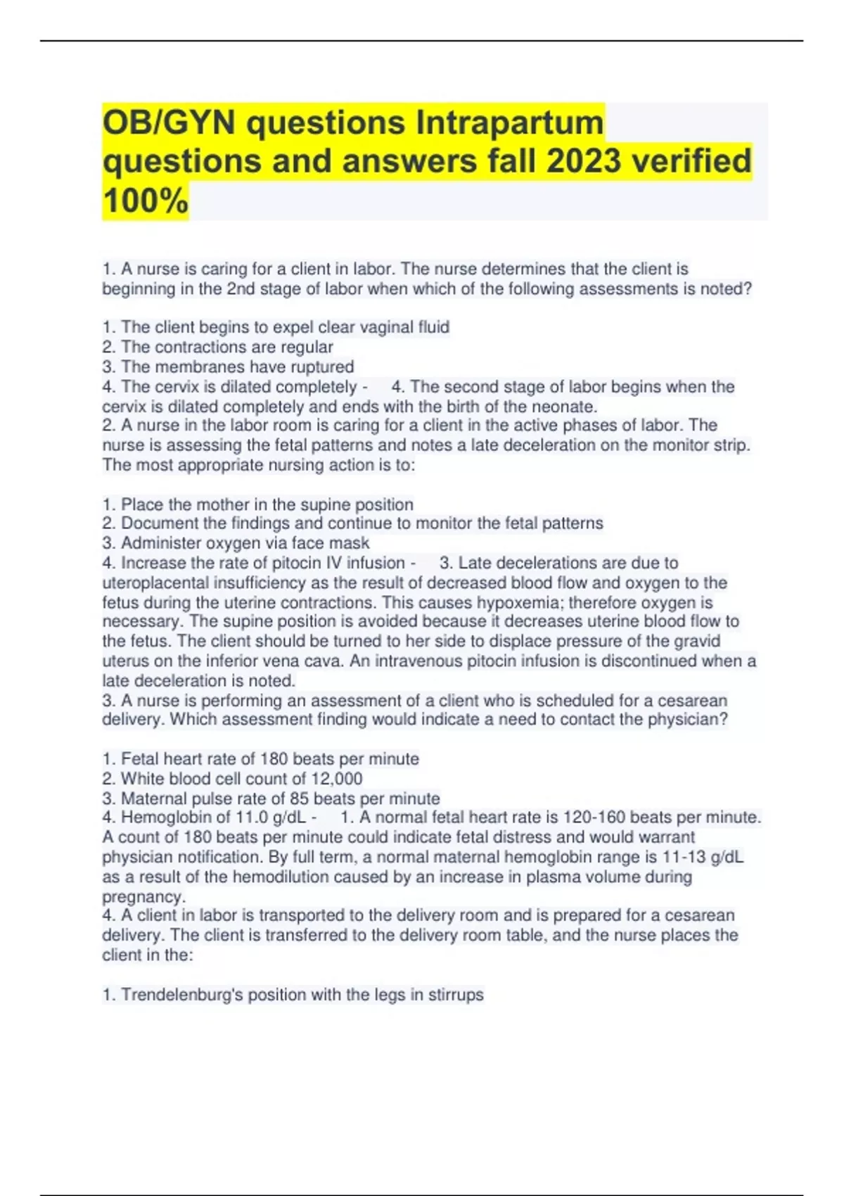 OB/GYN questions Intrapartum questions and answers fall 2023 verified 100% 1. A nurse is caring for a client in labor. The nurse determines that the client is beginning in the 2nd stage of labor when which of the following assessments is noted? 1. The client begins to expel clear vaginal fluid 2. The contractions are regular 3. The membranes have ruptured 4. The cervix is dilated completely - 4. The second stage of labor begins when the cervix is dilated completely and ends with the birth of the neonate. 2. A nurse in the labor room is caring for a client in the active phases of labor. The nurse is assessing the fetal patterns and notes a late deceleration on the monitor strip. The most appropriate nursing action is to: 1. Place the mother in the supine position 2. Document the findings and continue to monitor the fetal patterns 3. Administer oxygen via face mask 4. Increase the rate of pitocin IV infusion - 3. Late decelerations are due to uteroplacental insufficiency as the result of decreased blood flow and oxygen to the fetus during the uterine contractions. This causes hypoxemia; therefore oxygen is necessary. The supine position is avoided because it decreases uterine blood flow to the fetus. The client should be turned to her side to displace pressure of the gravid uterus on the inferior vena cava. An intravenous pitocin infusion is discontinued when a late deceleration is noted. 3. A nurse is performing an assessment of a client who is scheduled for a cesarean delivery. Which assessment finding would indicate a need to contact the physician? 1. Fetal heart rate of 180 beats per minute 2. White blood cell count of 12,000 3. Maternal pulse rate of 85 beats per minute 4. Hemoglobin of 11.0 g/dL - 1. A normal fetal heart rate is 120-160 beats per minute. A count of 180 beats per minute could indicate fetal distress and would warrant physician notification. By full term, a normal maternal hemoglobin range is 11-13 g/dL as a result of the hemodilution caused by an increase in plasma volume during pregnancy. 4. A client in labor is transported to the delivery room and is prepared for a cesarean delivery. The client is transferred to the delivery room table, and the nurse places the client in the: 1. Trendelenburg's position