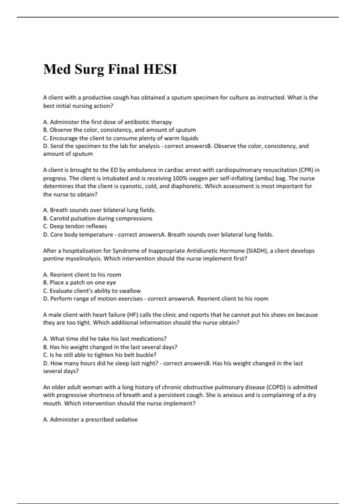 Med Surg Final HESI A client with a productive cough has obtained a sputum specimen for culture as instructed. What is the best initial nursing action? A. Administer the first dose of antibiotic therapy B. Observe the color, consistency, and amount of sputum C. Encourage the client to consume plenty of warm liquids D. Send the specimen to the lab for analysis - correct answersB. Observe the color, consistency, and amount of sputum A client is brought to the ED by ambulance in cardiac arrest with cardiopulmonary resuscitation (CPR) in progress. The client is intubated and is receiving 100% oxygen per self-inflating (ambu) bag. The nurse determines that the client is cyanotic, cold, and diaphoretic. Which assessment is most important for the nurse to obtain? A. Breath sounds over bilateral lung fields. B. Carotid pulsation during compressions C. Deep tendon reflexes D. Core body temperature - correct answersA. Breath sounds over bilateral lung fields. After a hospitalization for Syndrome of Inappropriate Antidiuretic Hormone (SIADH), a client develops pontine myselinolysis. Which intervention should the nurse implement first? A. Reorient client to his room B. Place a patch on one eye C. Evaluate client's ability to swallow D. Perform range of motion exercises - correct answersA. Reorient client to his room A male client with heart failure (HF) calls the clinic and reports that he cannot put his shoes on because they are too tight. Which additional information should the nurse obtain? A. What time did he take his last medications? B. Has his weight changed in the last several days? C. Is he still able to tighten his belt buckle? D. How many hours did he sleep last night? - correct answersB. Has his weight changed in the last several days? An older adult woman with a long history of chronic obstructive pulmonary disease (COPD) is admitted with progressive shortness of breath and a persistent cough. She is anxious and is complaining of a dry mouth. Which intervention should the nurse implement? A. Administer a prescribed sedative B. Encourage client to drink water C. Apply a high-flow venturi mask D. Assist her to an upright position - correct answersD. Assist her to an upright position A client with a history of asthma and bronchitis arrives at the clinic with shortness of breath, productive cough with thickened tenacious mucous, and the inability to walk up a flight of stairs without experiencing breathlessness. Which action is most important for the nurse to instruct the client about self-care? A. Increase the daily intake of oral fluids to liquefy secretions B. Avoid crowded enclosed areas to reduce pathogen exposure C. Call the clinic if undesirable side effects of mediations occur D. Teach anxiety reduction methods for feelings of suffocation - correct answersA. Increase the daily intake of oral fluids to liquefy secretions A cardiac catherterization of a client with heart disease indicates the following blockages: 95% proximal left anterior descending (LAD), 99% proximal circumflex, and ? % proximal right coronary artery (RCA). The client later asks the nurse "what does all this mean for me?" What information should the nurse provide? A. Blood supply to the heart is diminished by artherosclerotic lesions, which necessitate lifestyle changes. B. Blood vessels supplying the pumping chamber have blockages indicating a past heart attack. C. Three main arteries have major blockages, with only 1 to 5% of blood flow getting through to the heart muscle. D. The heart is not receiving enough blood, so there is a risk of heart failure and fluid retention. - correct answersC. Three main arteries have major blockages, with only 1 to 5% of blood flow getting through to the heart muscle. A client who weighs 175 pounds is receiving IV bolus dose of heparin 80 units/kg. The heparin is available in a 2 ml vial, labeled 10,000 units/ml. How many ml should the nurse administer? (Enter numeric value only. If rounding is required, round to the nearest tenth.) - correct answers0.6 ml What information should the nurse include in the teaching plan of a client diagnosed with gastroesophageal reflux disease (GERD)? A. Sleep without pillows at night to maintain neck alignment. B. Adjust food intake to three full meals per day and no snacks. C. Minimize symptoms by wearing loose, comfortable clothing D. Avoid participation in any aerobic exercise programs - correct answersC. Minimize symptoms by wearing loose, comfortable clothing The nurse is caring for a client with a lower left lobe pulmonary abscess. Which position should the nurse instruct the client to maintain? A. left lateral B. Supine, knees flexed C. Dorsal recumbent D. Knee-chest - correct answersA. left lateral A client with cholelithiasis has a gallstone lodged in the common bile duct and is unable to eat or drink without becoming nauseated and vomiting. Which finding should the nurse report to the healthcare provider. A. Belching B. Amber urine C. Yellow sclera D. Flatulence - correct answersC. Yellow sclera While caring for a client with Amyotrophic Lateral Sclerosis (ALS), the nurse performs a neurological assessment every four hours. Which assessment finding warrants immediate intervention by the nurse? A. Inappropriate laughter B. Increasing anxiety C. Weakened cough effort D. Asymmetrical weakness - correct answersC. Weakened cough effort The nurse is providing preoperative education for a Jewish client scheduled to receive a xenograft graft to promote burn healing. Which information should the nurse provide this client? A. Grafting increases the risk for bacterial infections B. The xenograft is taken from nonhuman sources C. Grafts are later removed by a debriding procedure D. As the burn heals, the graft permanently attaches - correct answersB. The xenograft is taken from nonhuman sources A male client who had colon surgery 3 days ago is anxious and requesting assistance to reposition. While the nurse is turning him, the wound dehiscences and 