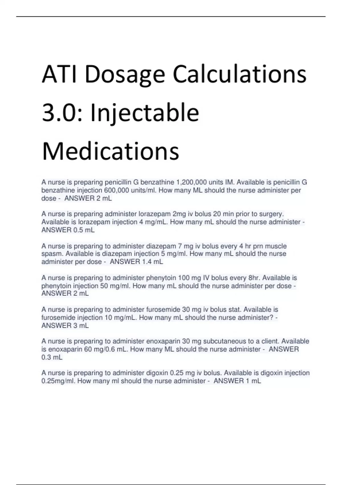 ATI Dosage Calculations 3.0: Injectable Medications A nurse is preparing penicillin G benzathine 1,200,000 units IM. Available is penicillin G benzathine injection 600,000 units/ml. How many ML should the nurse administer per dose - ANSWER 2 mL A nurse is preparing administer lorazepam 2mg iv bolus 20 min prior to surgery. Available is lorazepam injection 4 mg/mL. How many mL should the nurse administer - ANSWER 0.5 mL A nurse is preparing to administer diazepam 7 mg iv bolus every 4 hr prn muscle spasm. Available is diazepam injection 5 mg/ml. How many mL should the nurse administer per dose - ANSWER 1.4 mL A nurse is preparing to administer phenytoin 100 mg IV bolus every 8hr. Available is phenytoin injection 50 mg/ml. How many mL should the nurse administer per dose - ANSWER 2 mL A nurse is preparing to administer furosemide 30 mg iv bolus stat. Available is furosemide injection 10 mg/mL. How many mL should the nurse administer? - ANSWER 3 mL A nurse is preparing to administer enoxaparin 30 mg subcutaneous to a client. Available is enoxaparin 60 mg/0.6 mL. How many ML should the nurse administer - ANSWER 0.3 mL A nurse is preparing to administer digoxin 0.25 mg iv bolus. Available is digoxin injection 0.25mg/ml. How many ml should the nurse administer - ANSWER 1 mL