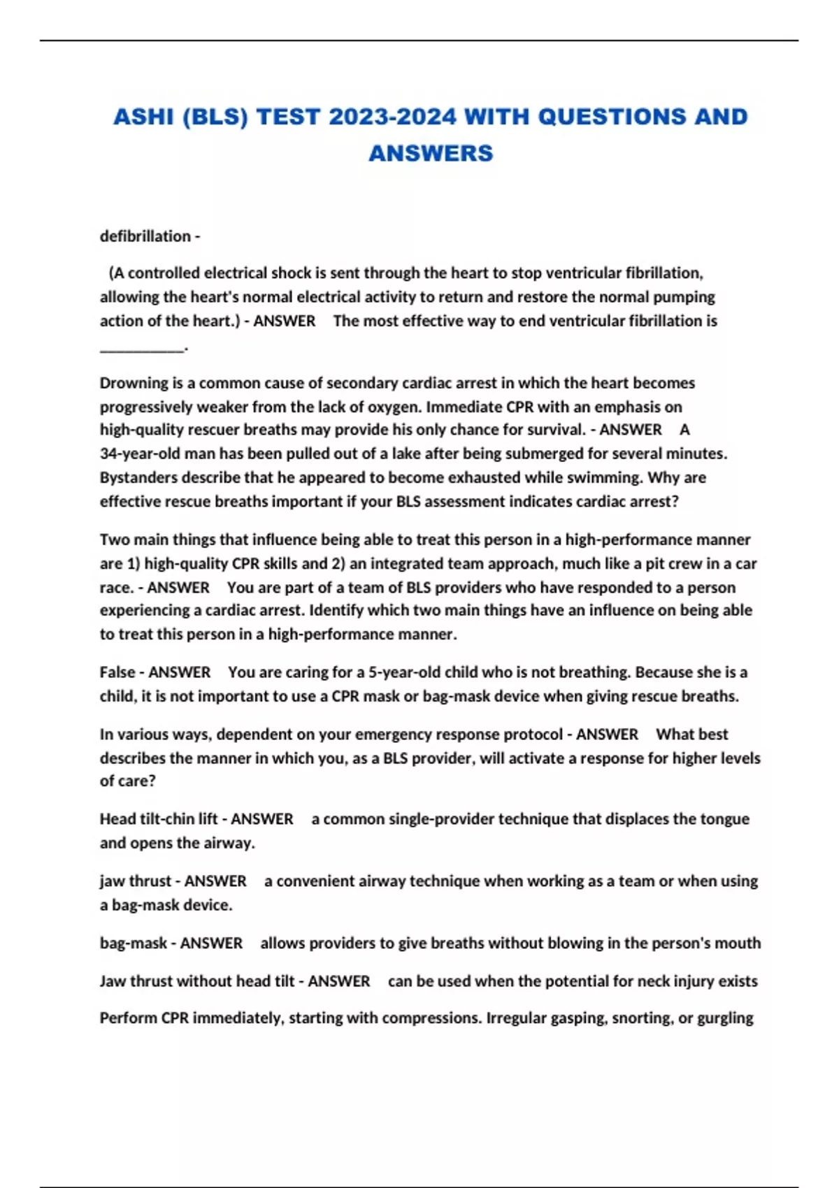 ASHI (BLS) TEST WITH QUESTIONS AND ANSWERS...