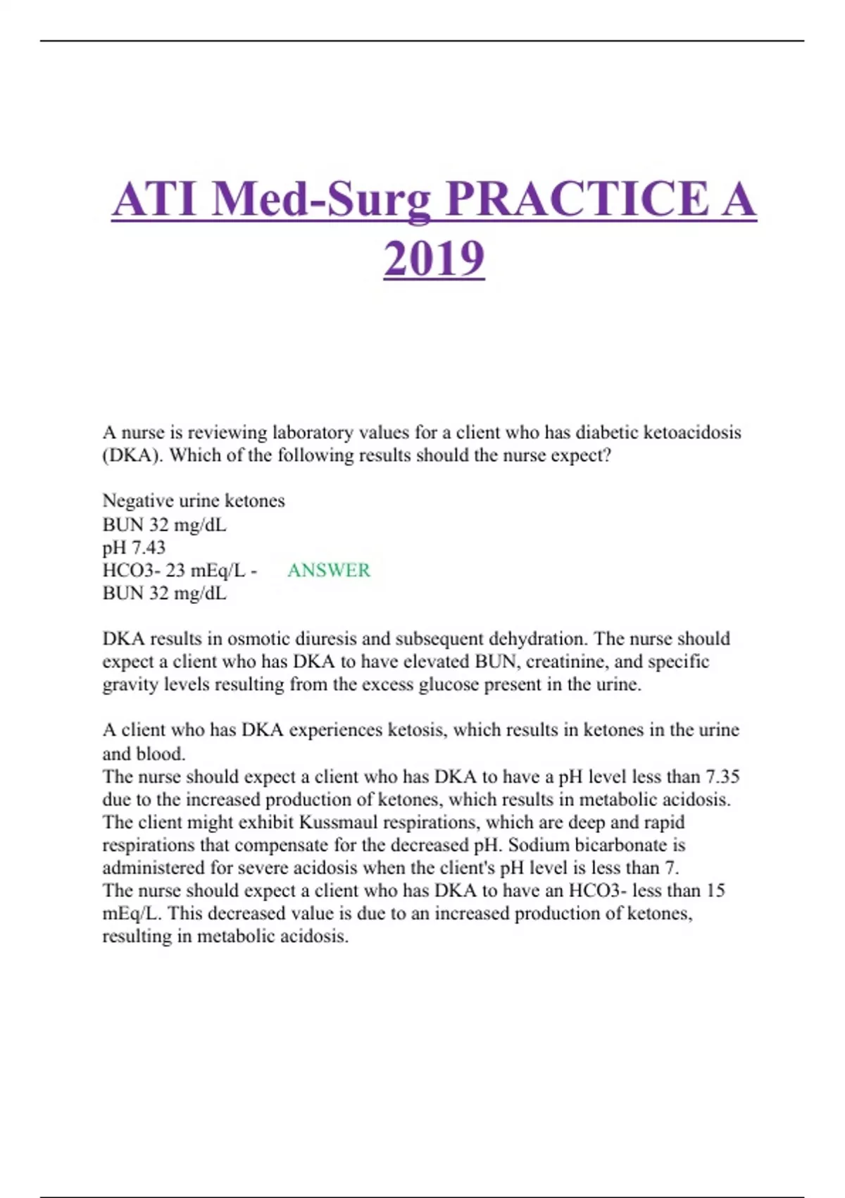 ATI Med-Surg PRACTICE A 2019 A nurse is reviewing laboratory values for a client who has diabetic ketoacidosis (DKA). Which of the following results should the nurse expect? Negative urine ketones BUN 32 mg/dL pH 7.43 HCO3- 23 mEq/L - ANSWER BUN 32 mg/dL DKA results in osmotic diuresis and subsequent dehydration. The nurse should expect a client who has DKA to have elevated BUN, creatinine, and specific gravity levels resulting from the excess glucose present in the urine. A client who has DKA experiences ketosis, which results in ketones in the urine and blood. The nurse should expect a client who has DKA to have a pH level less than 7.35 due to the increased production of ketones, which results in metabolic acidosis. The client might exhibit Kussmaul respirations, which are deep and rapid respirations that compensate for the decreased pH. Sodium bicarbonate is administered for severe acidosis when the client's pH level is less than 7. The nurse should expect a client who has DKA to have an HCO3- less than 15 mEq/L. This decreased value is due to an increased production of ketones, resulting in metabolic acidosis. A nurse and an assistive personnel (AP) are caring for a client who has bacterial meningitis. The nurse should give the AP which of the following instructions? Wear a Mask. Droplet Precautions Wear a gown. Keep the client's room well-lit. Maintain the head of the bed at a 45° elevation. - ANSWER Wear a Mask. Droplet Precautions A gown is necessary when caring for clients who require contact precautions. Bacterial meningitis does not spread via direct contact. Staff caring for this client should keep the illumination in the room dim and avoid bright light from windows to promote comfort and rest and avoid photophobia. Staff caring for this client should keep the head of the bed at a 30° elevation.