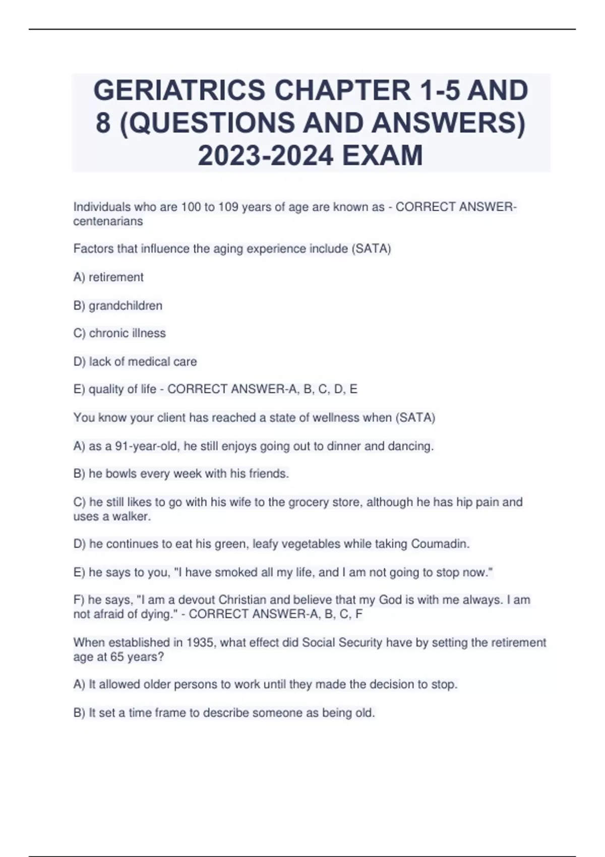 GERIATRICS CHAPTER 1-5 AND 8 (QUESTIONS AND ANSWERS) EXAM Individuals who are 100 to 109 years of age are known as - CORRECT ANSWERcentenarians Factors that influence the aging experience include (SATA) A) retirement B) grandchildren C) chronic illness D) lack of medical care E) quality of life - CORRECT ANSWER-A, B, C, D, E You know your client has reached a state of wellness when (SATA) A) as a 91-year-old, he still enjoys going out to dinner and dancing. B) he bowls every week with his friends. C) he still likes to go with his wife to the grocery store, although he has hip pain and uses a walker. D) he continues to eat his green, leafy vegetables while taking Coumadin. E) he says to you, "I have smoked all my life, and I am not going to stop now." F) he says, "I am a devout Christian and believe that my God is with me always. I am not afraid of dying." - CORRECT ANSWER-A, B, C, F When established in 1935, what effect did Social Security have by setting the retirement age at 65 years? A) It allowed older persons to work until they made the decision to stop. B) It set a time frame to describe someone as being old. C) It made it mandatory for all individuals to retire at 65 years of age. D) It made everyone realize that they could quit work at 65 years of age and live comfortably on the benefits. - CORRECT ANSWER-B Examples of interventions to promote wellness include all of the following EXCEPT A) influenza and pneumonia vaccinations. B) breast cancer screenings. C) psychiatric screenings. D) colorectal screenings. - CORRECT ANSWER-C Healthy People 2020 has identified emerging issues and recommendations for the aging baby boomers and those in between. Which of the following are Healthy People 2020's recommendations? (SATA) A) Coordinate care. B) Establish quantity measures. C) Research and analyze appropriate training to equip providers. D) Identify minimum levels of training for people who care for older adults. - CORRECT ANSWER-A, C, D To help nurses grow through their own ethnocentrism, nurses must develop all of the following EXCEPT A) knowledge about ethnicity. B) knowledge about cultures. C) full dependence on verbal, facial, and body expressions to get their point across. D) knowledge about another culture's health belief system. - CORRECT ANSWER-C During an assessment of an older adult, which of the following would the nurse see as a priority? A) Listening as key to an assessment B) Using the Kleinman and associates model C) Attempting to preserve helpful beliefs and practices D) Providing ongoing assistance to persons who are physically or mentally ill - CORRECT ANSWER-A Ageism is a term used to describe the discrimination and negative stereotypes that are based solely on age. From the following list, which statement does not reflect ageism? A) Anti-aging products B) Graphic portrayals mocking the ability of older adults C) Mandatory retirement policies D) Demonstrations of respect for the older adult - CORRECT ANSWER-D As a nurse today taking care of an older adult from a different culture, you would have a refined set of skills that would include all of the following EXCEPT A) working with the client, not on the client. B) listening carefully to the older adult for his or her perception of the situation. C) being able to explain your perceptions clearly and nonjudgmentally. D) developing a plan of action that takes both the client's and your perspectives into account and negotiates an outcome. - CORRECT ANSWER-C The concept of balance, chi, and disturbances in balance that result in disharmony and illness are examples that demonstrate what type of health system? A) Naturalistic B) Personalistic C) Western D) Magicoreligious - CORRECT ANSWER-A __ is the application of limited knowledge about one person with specific characteristics to other persons with the same characteristics. A) Ethnicity B) Stereotyping C) Ethnocentrism D) Health disparities - CORRECT ANSWER-B An older adult client has fallen in his yard, resulting in a 4-inch laceration on his forearm. As the home health nurse caring for him, you need to reassure him of all EXCEPT A) if the laceration becomes pink several days after the injury, this is normal as healing has begun. B) if he notices any lack of scabbing, he needs to notify the physician. C) the healing process will begin immediately. D) evidence of a true skin infection in an older adult is the same as that for a younger person. - CORRECT ANSWER-C As the nurse of an older adult, you observe signs of aging skin. You would advise your client to (SATA) A) avoid all exposure to ultraviolet light. B) keep his or her skin moist. C) always use sunscreen. D) keep well hydrated. E) not worry about smoking. F)not worry about purpura. - CORRECT ANSWER-B, C, D You realize an older adult woman does not understand how to maintain healthy bones and muscles when she makes which one of the following statements? A) "I participate every morning in my assisted living community's healthy activity programs." B) "I enjoy going to my senior center and participating in its Tai Chi program." C) "My spouse loves to walk every evening and encourages me to go along, but I am just too tired to do so."