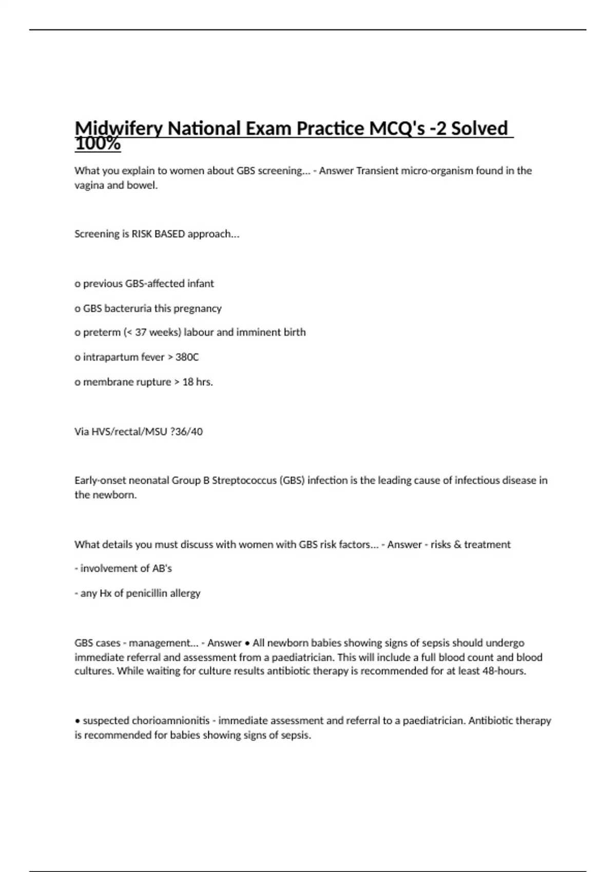 What you explain to women about GBS screening... - Answer Transient micro-organism found in the vagina and bowel. Screening is RISK BASED approach... o previous GBS-affected infant o GBS bacteruria this pregnancy o preterm (< 37 weeks) labour and imminent birth o intrapartum fever > 380C o membrane rupture > 18 hrs. Via HVS/rectal/MSU ?36/40 Early-onset neonatal Group B Streptococcus (GBS) infection is the leading cause of infectious disease in the newborn. What details you must discuss with women with GBS risk factors... - Answer - risks & treatment - involvement of AB's - any Hx of penicillin allergy GBS cases - management... - Answer • All newborn babies showing signs of sepsis should undergo immediate referral and assessment from a paediatrician. This will include a full blood count and blood cultures. While waiting for culture results antibiotic therapy is recommended for at least 48-hours. • suspected chorioamnionitis - immediate assessment and referral to a paediatrician. Antibiotic therapy is recommended for babies showing signs of sepsis. • Healthy-appearing babies born at > 35-weeks gestation to women with GBS risk factors and who have received appropriate antibiotics > 4-hours before birth require no investigations or treatment, but should be observed closely for at least 24 hours post-partum. This includes close observation at home. • Well-appearing babies born at > 35-weeks gestation to women with GBS risks factors who have received either no or inadequate (< 4-hours) antibiotics during labour should be observed closely for at least 24-hours. It is recommended that this be in hospital and that referral may be considered. • Well-appearing babies born at < 35-week gestation to women without chorioamnionitis, who have not received antibiotics > 4 hours before birth need close observation for at least 48-hours. It is recommended that this be in hospital and that referral may be considered. placenta previa - Answer • bleeding from an abnormally located placenta Which of the following are associated with placenta previa? 1. Prev C/S 2. Prev uterine curettage 3. Primips 4. Anaemia 5. Male fetus 6. Congentital abnormality a. 1 and 3 b. 2, 4, 5 c. 1, 2, 4, 5, 6 d. all of the above - Answer c. 1, 2, 4, 5, 6 - Prev C/S - Prev placenta curettage - abortion - Endometriosis - Multiparty - Age -Anaemia - Smoking (enlarged placenta) - Multiple preg - congentital abnorm - MALE fetus - placental abnormality: Biparietal What is the best practice if placenta previa/vasa previa is diagnosed at or beyond 32/40? a. Consultation b. USS at 36/40 c. Transfer of care d. USS in 2 weeks time - Answer c. Transfer of care Realistically.. can compromise shared care What should be your management plan if after a USS you find EFW < 10th percentile on customised growth chart, or abdominal circumference (AC) < 5th percentile on ultrasound, or discordancy of AC with other growth parameters with normal liquor and normal umbilical doppler? a. Transfer of care b. Consultation with obstetrician c. Consultation with paediatrician d. Frequent growth scans - Answer b. Consultation with obstetrician If placenta previa is found at the dating scan, what is the best management? a. USS at 20/40 and 36/40 b. USS at NT, 20/40 and 36/40 c. USS at 20/40, 32/40 and 34/40 d. USS at NT, 20/40 AND 32/40 and if persists refer to specialist - Answer d. USS at NT, 20/40 AND 32/40 and if persists refer to specialist A unbooked woman turns up to the secondary unit that you work at as a core midwife. Which of the following signs may indicate placenta previa? 1. High head 2. Unstable lie 3. Transverse or oblique lie 4. painless bleeding a. 4 only b. 2, 3, 4 c. 2 and 4 d. all of the above - Answer d. all of the above Which of the following are symptoms of acute placenta previa? a. painless bleeding, hard abdomen, no history of trauma, unstable lie b. painful bleeding, soft abdomen, no history of trauma, stable lie c. Painless bleeding, no hx of trauma, soft abdomen, unstable lie d. Painful bleeding, may have history of trauma, hard abdomen, unstable lie - Answer c. Painless bleeding, no hx of trauma, soft abdomen, unstable lie What should be your management plan if after a USS you find EFW < 10th percentile on customised growth chart, or abdominal circumference (AC) < 5th percentile on ultrasound, or discordancy of AC with other growth parameters with abnormal liquor or abnormal umbilical doppler? a. Transfer of care b. Consultation with obstetrician c. Consultation with paediatrician d. Frequent growth scans - Answer a. Transfer of care If a woman reports a previous LGA birth weight, what percentile must it be OVER before a consultation is required? a. >98th b. >97th c >90th d. >95th - Answer b. >97th What amount requires consultation if a woman has a history of PPH? a. >500 mls b. 100mls c. >1000mls d. 500mls - Answer c. >1000mls What amount of miscarriages calls for a consultation? a. 5 or more b. 3 or more c. 2 or more d. 4 or more - Answer b. 3 or more If a woman has a hx of SUDI, what type of referral is required? a. primary b. consultation c. transfer of care d. not required - Answer a. primary What is the prinicple purpose for the NZMC? a. to protect the health and safety of members of the public by providing for mechanisms to ensure that health professionals are competent and fit to practise their professions b. Professional Organisation of Midwives and recognised 'voice' for midwives and student midwives in New Zealand c. To set standards of clinical competence, cultural competence, and ethical conduct to be observed by health professionals of the profession - Answer c. To set standards of clinical competence, cultural competence, and ethical conduct to be observed by health professionals of the profession What are the functions of the Midwifery Council? 1. Prescribe qualifications 2. Authorise registration 3. Review and Promote competence 4 Address concerns about competence 5. notify employers, ACC, the Director Gen